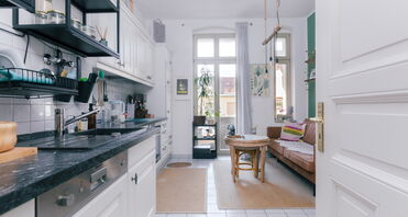 Die Küche ist außergewöhnlich groß geschnitten und als Wohnküche nutzbar. Eine zeitlose Einbauküche inklusive Geschirrspüler ist vorhanden. Eine separate Speisekammer sorgt für zusätzlichen Stauraum – ein Detail, das von Mietern besonders geschätzt wird.