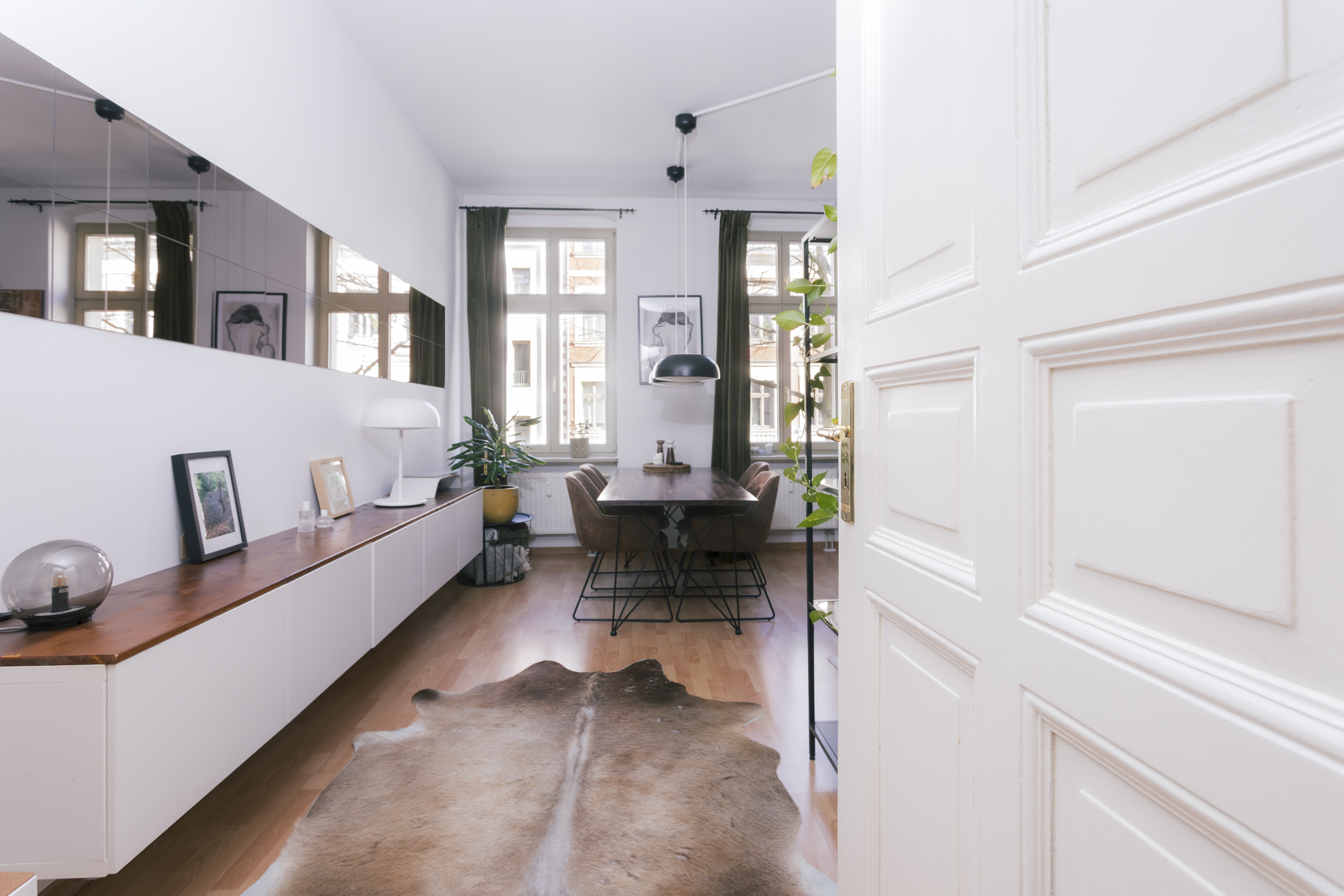 Das überdurchschnittlich große Wohnzimmer profitiert von drei großen Fenstern, die für eine sehr gute Belichtung sorgen. Eine große Wohnlandschaft und ein separater Essbereich finden hier wunderbar Platz. Die hohen Decken sorgen für ein angenehmes Raumgefühl mit historischem Charme.