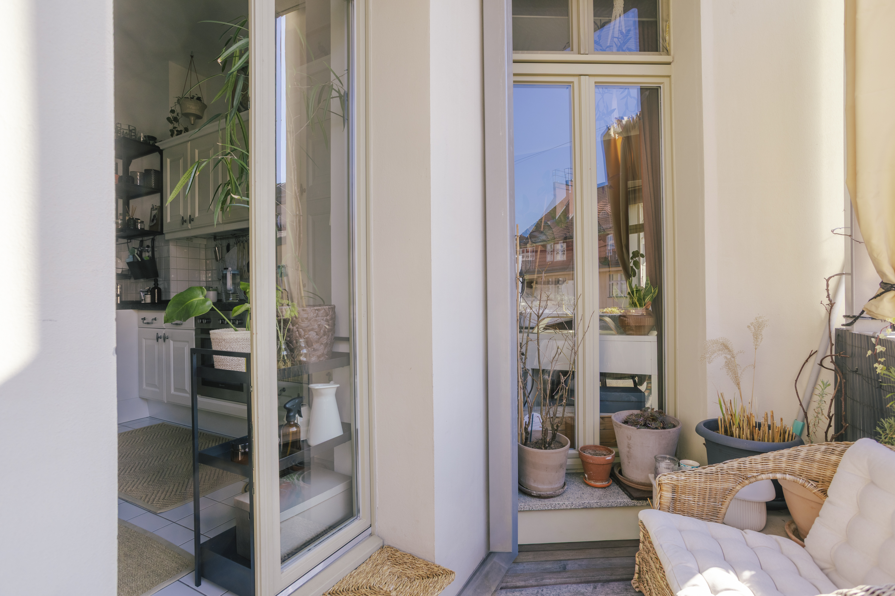 Sowohl Wohn- als auch Schlafzimmer sind mit Laminat ausgestattet. Das geräumige Schlafzimmer bietet Zugang zur großzügigen, geschützten Terrasse mit Sichtschutz – ein echtes Mehrwertmerkmal im innerstädtischen Bereich. Zusätzlich steht ein Balkon zur Verfügung.