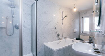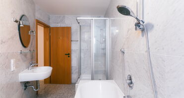 - Badezimmer mit Dusche und Badewanne.