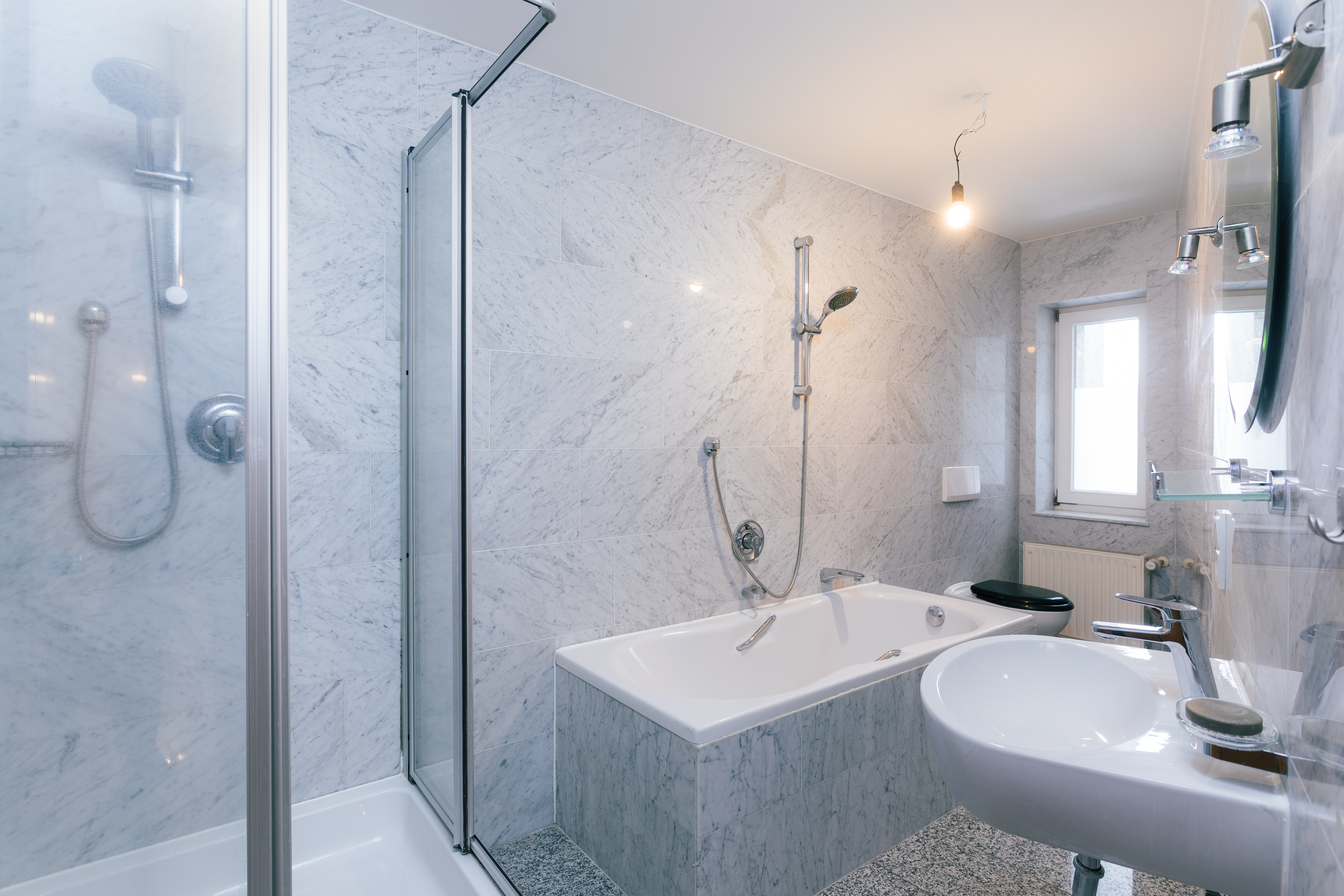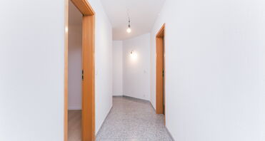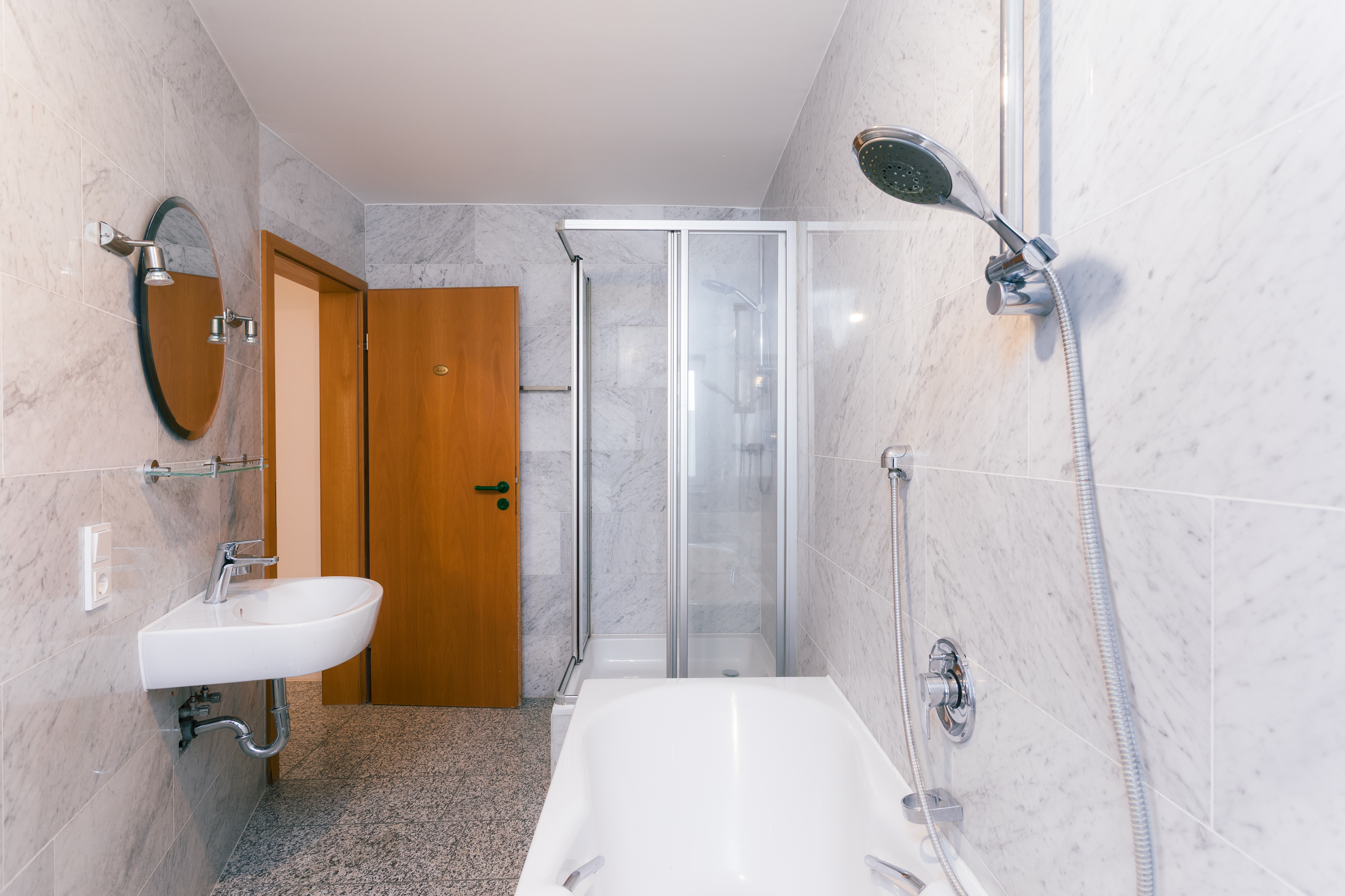 Das Badezimmer liegt am Ende des Flurs und ist vollständig gefliest. Es verfügt über eine Badewanne und eine Dusche. Ein Fenster sorgt für Tageslicht und natürliche Belüftung mit Blick in den ruhigen Innenhof. Bad und Küche befinden sich in einem soliden, gepflegten Zustand und bieten Potenzial für eine spätere Modernisierung – ein Pluspunkt für Käufer, die Wert auf Entwicklungsmöglichkeiten legen.