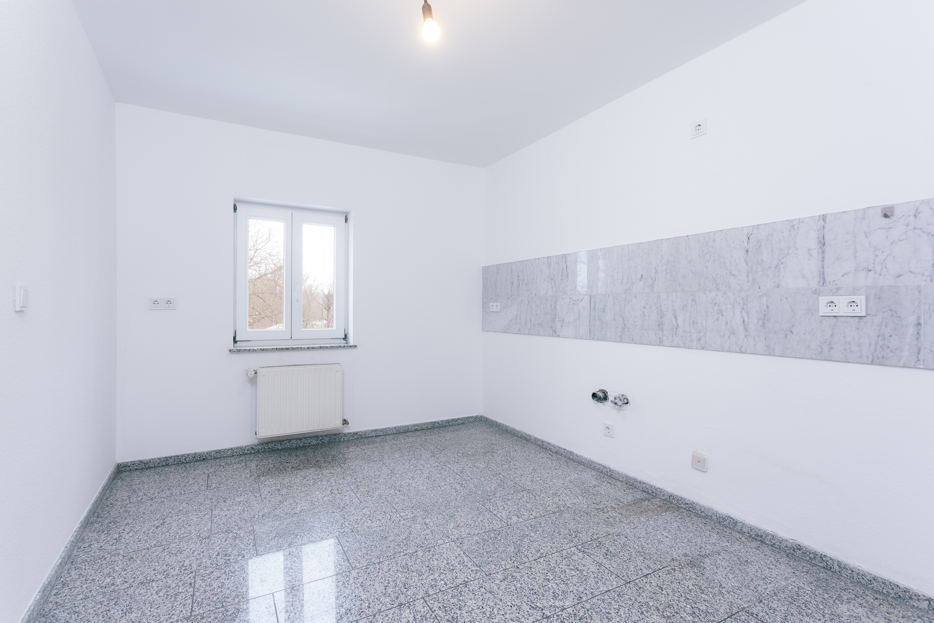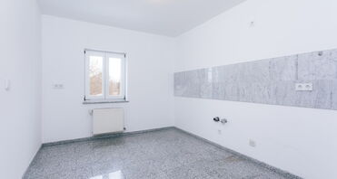 Die Küche ist direkt vom Wohnzimmer aus zugänglich. Sie befindet sich in einem gepflegten, funktionalen Zustand und ist bewusst ohne Einbauküche gehalten, sodass Käufer oder Mieter ihre individuellen Vorstellungen umsetzen können. Angrenzend befindet sich ein praktischer Abstellraum sowie ein weiterer kleiner Raum mit der Etagenheizung und einem Waschmaschinenanschluss – ein klarer Vorteil in puncto Stauraum und Funktionalität.
