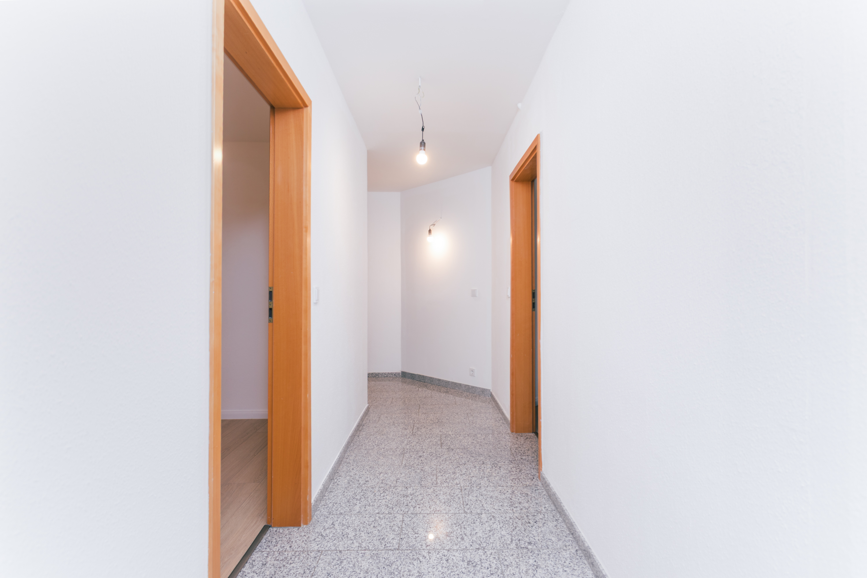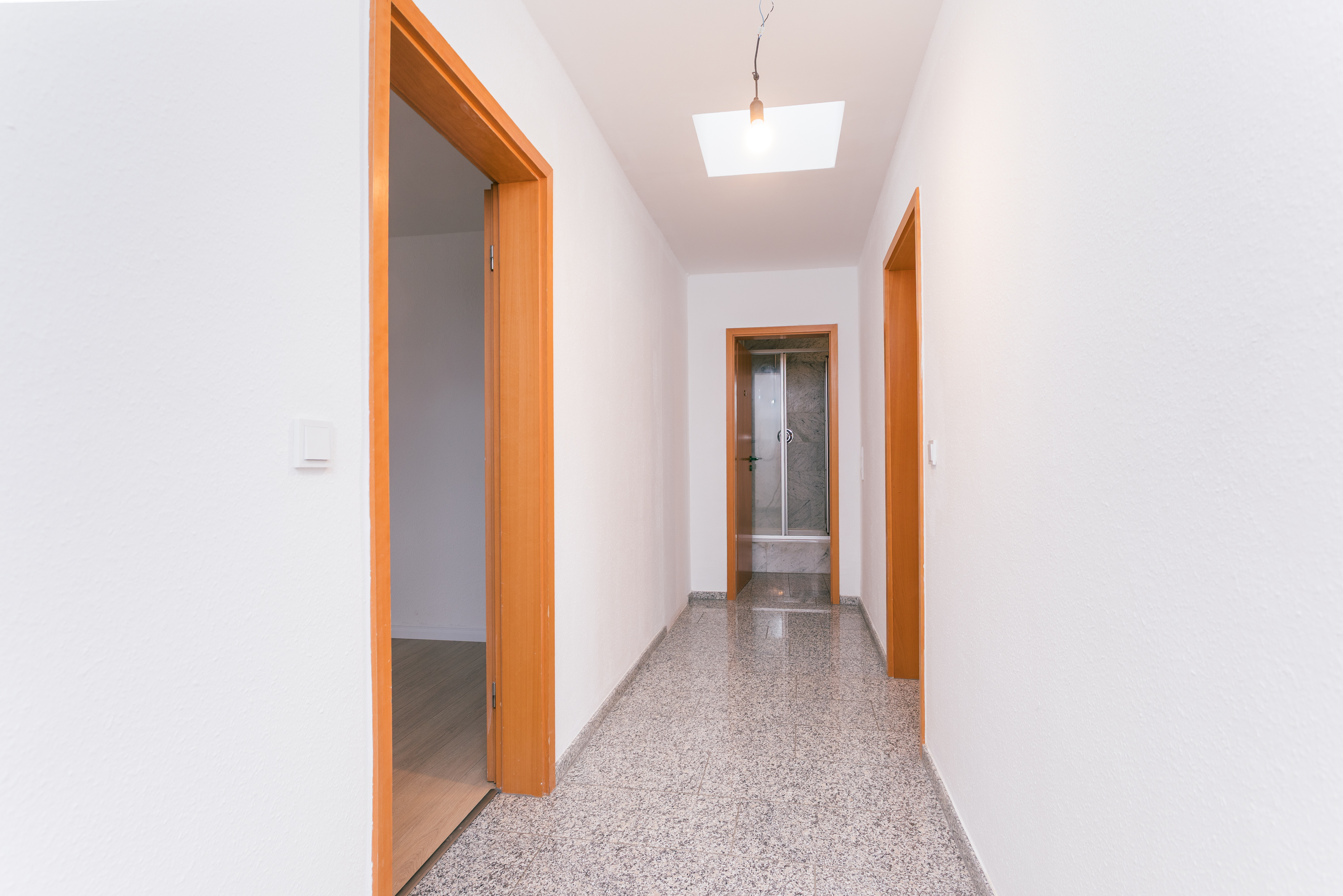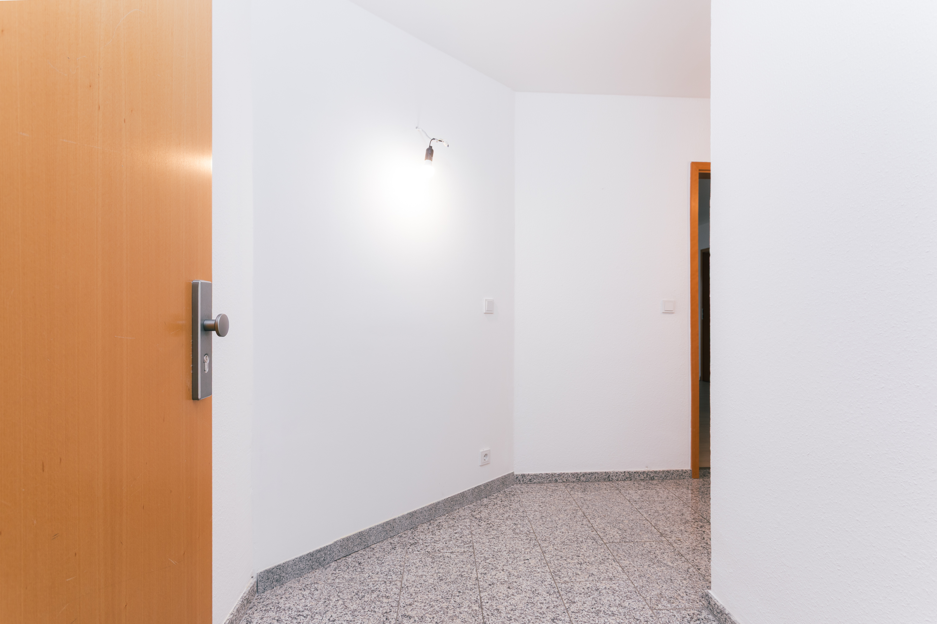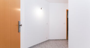 Der Flur bietet zusätzlich Platz für eine Garderobe. Ein Oberlicht lässt Tageslicht in den Eingangsbereich fallen und unterstreicht den freundlichen, hellen Gesamteindruck der Wohnung.
