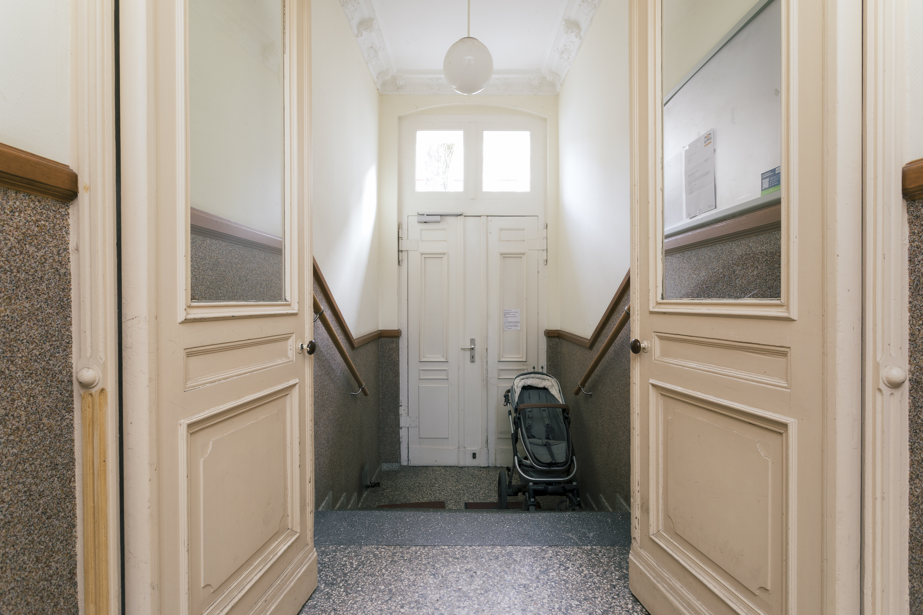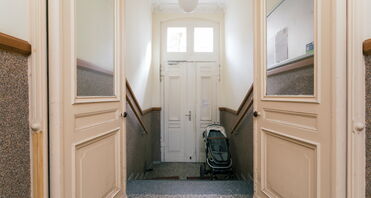Über den gepflegten Flur, altbautypisch erhalten und mit schönen Bildern an den Wänden, gelangt man das Treppenhaus hinauf in die Wohnung im 2. Obergeschoss. Die traditionelle Atmosphäre des Hauses wird bereits beim Betreten spürbar und schafft einen einladenden ersten Eindruck.