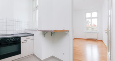 Dahinter befindet sich die kleine, praktisch eingerichtete Einbauküche, die alle wichtigen Elemente für den täglichen Bedarf bereitstellt; der Kühlschrank steht separat. Vom Küchenfenster aus gibt es einen schönen Blick in den begrünten Innenhof.