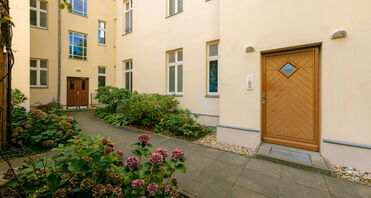 Das Haus stammt aus dem Jahr 1896 und umfasst insgesamt 14 Wohneinheiten. Das gesamte Gebäude wurde 1998 komplett kernsaniert. Es besteht aus einem Vorderhaus, sowie einem Seitenflügel. Das Gebäude erstreckt sich über vier Etagen. Die zum Verkauf stehende Wohnung befindet sich im zweiten Obergeschoss des Vorderhauses. Der Hausflur ist gepflegt und präsentiert sich mit liebevoll erhaltenen historischen Details wie Stuckelementen und stilvollen Wandbildern. Zur Wohnung gehört außerdem ein eigenes Kellerabteil. Der begrünte Innenhof steht allen Bewohnern zur gemeinsamen Nutzung und Entspannung zur Verfügung.