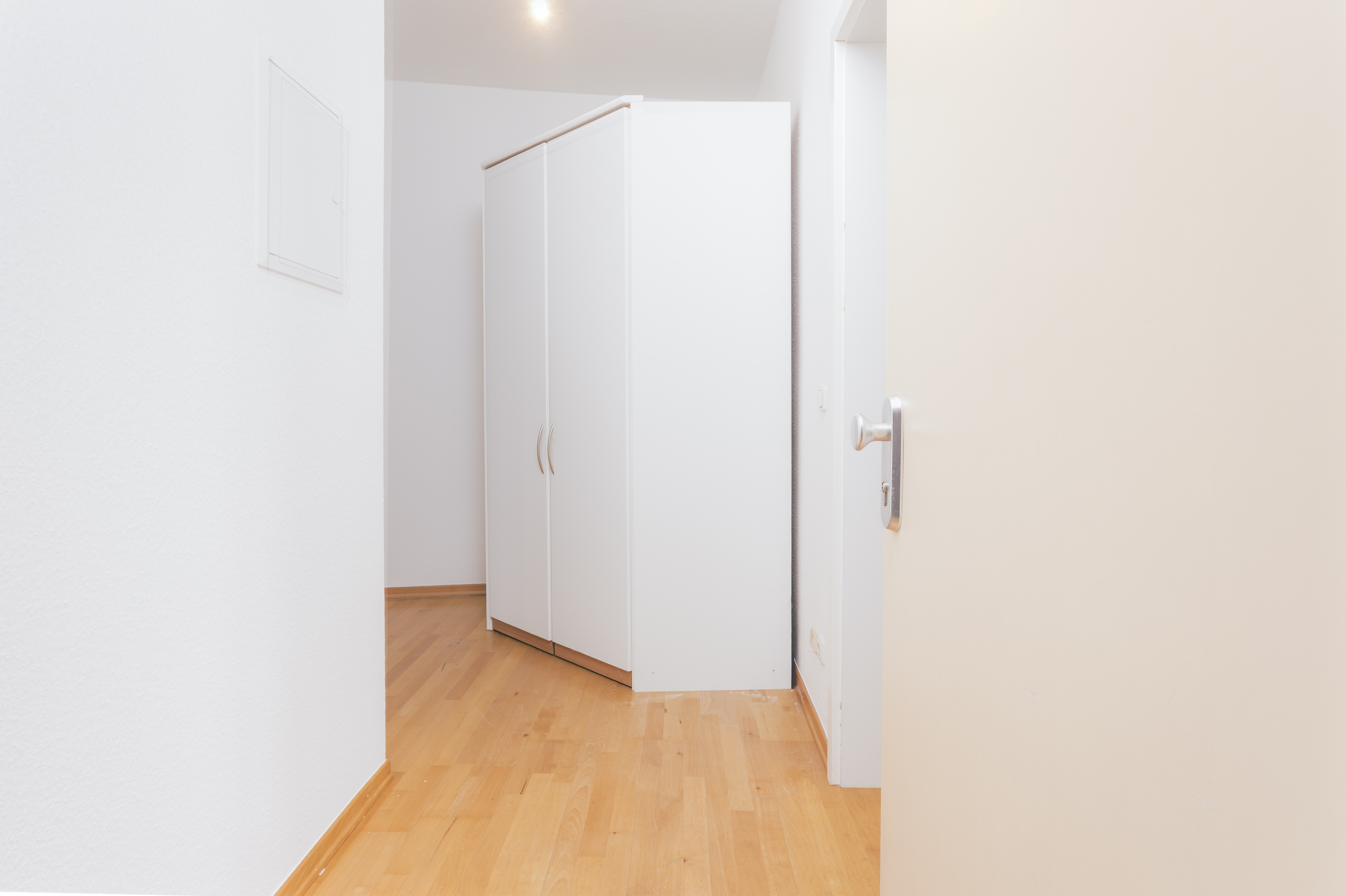 Der Flur ist großzügig geschnitten und bietet ausreichend Platz für einen großen Garderoben- oder Schuhschrank. Aktuell befindet sich ein passender Schrank im Flur, der zusätzlichen Stauraum bietet und die Ordnung erleichtert.