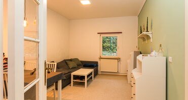 Rechterhand der Küche befindet sich ein vielseitig nutzbarer Raum, der derzeit als Büro und Mehrzweckraum dient. Daran schließt sich das großzügige Schlafzimmer mit Platz für ein Doppelbett und einen Kleiderschrank an. Ebenfalls über den Mehrzweckraum erreicht man das kompakte Badezimmer mit Badewanne und Waschmaschinenanschluss. Zwei Fenster sorgen für ausreichend Belichtung und Belüftung.