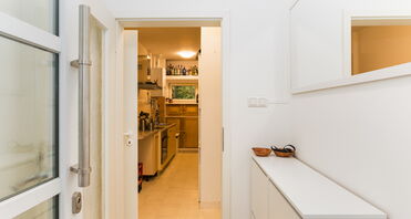 Das Herzstück des Hauses ist die zentral gelegene Küche mit einer Einbauküche und direktem Zugang zur zweiten Terrasse auf der Hausrückseite. Von der Küche aus gelangt man linkerhand in den geräumigen Wohnbereich, der ausreichend Platz für Couch und Esstisch bietet – mit einem schönen Blick ins Grüne. Eine angrenzende kleine Bibliothek eignet sich ideal als Homeoffice-Bereich.