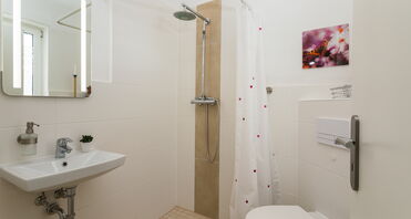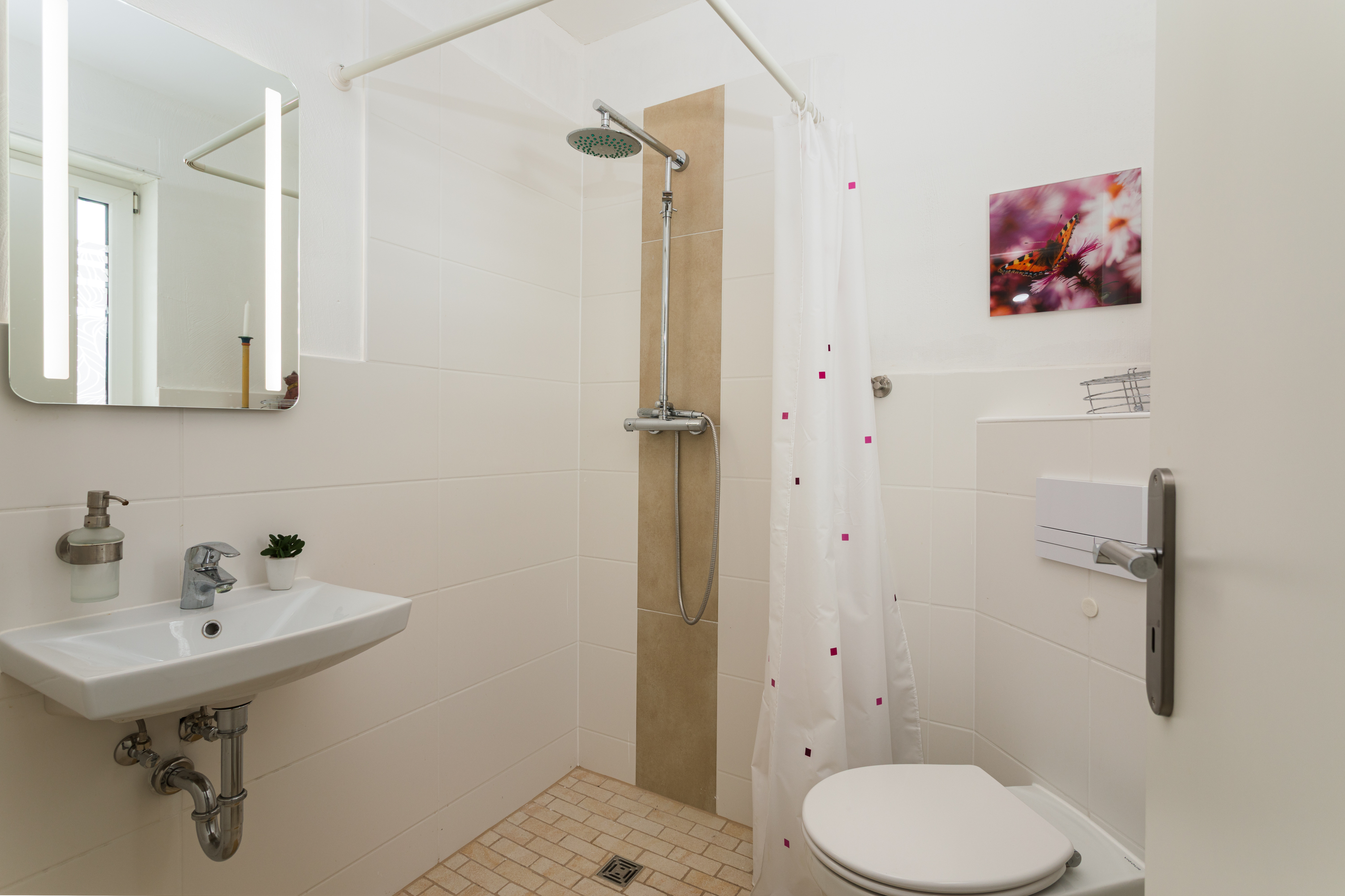 Gleich der erste Raum ist das stilvolle Gäste-Bad – ausgestattet mit Fenster und moderner Dusche. Die Gestaltung ist funktional und zeitlos, ideal für Gäste oder den morgendlichen Schnellstart.