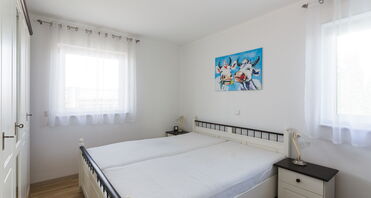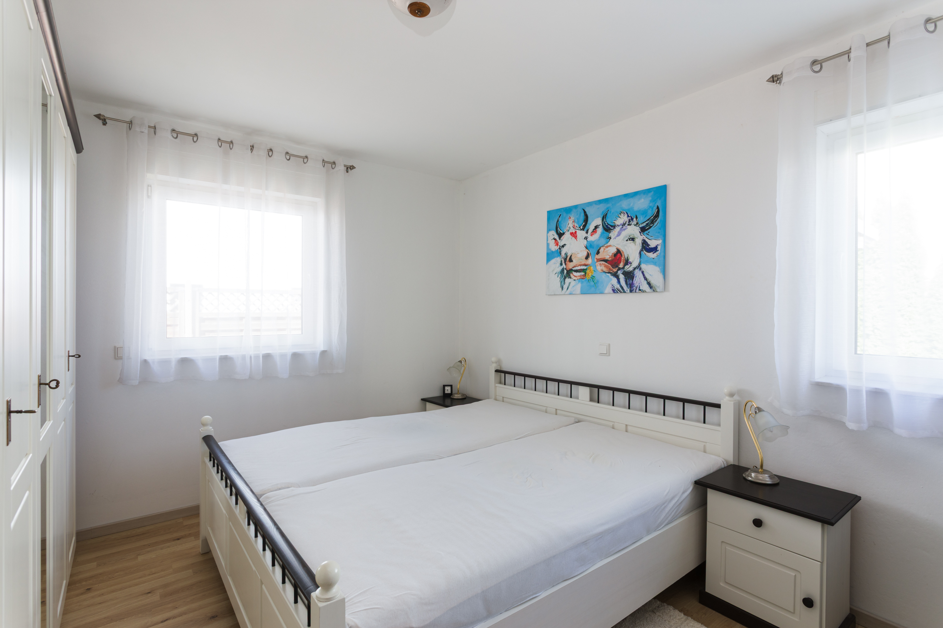 Das Schlafzimmer liegt im hinteren Bereich des Hauses und bietet viel Raum für ein großes Bett sowie eine praktische Schranklösung. Wie alle Wohnräume ist es hell und freundlich. Elektrische Rollläden an allen Fenstern sorgen für Komfort und Privatsphäre.