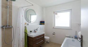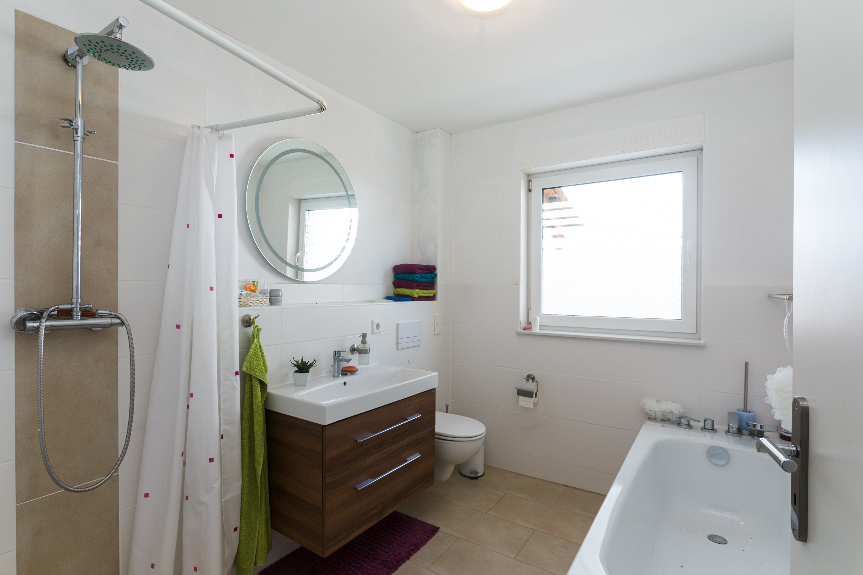 Das zweite Badezimmer befindet sich neben dem Schlafzimmer und gegenüber dem Kinderzimmer. Es ist mit einer Badewanne ausgestattet und verfügt über ein großes Fenster zum optimalen Lüften. Zwei Bäder bieten hier den klaren Vorteil: Kein morgendliches Gedränge – ideal für Familien oder Gäste.