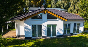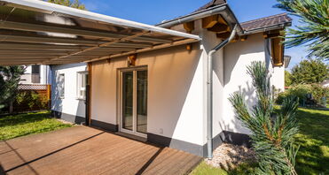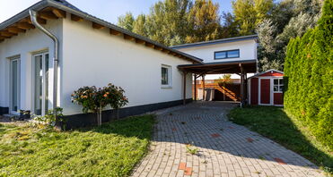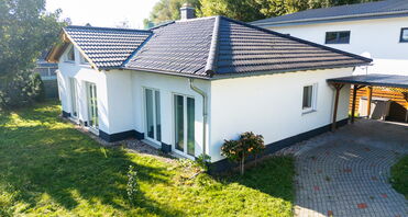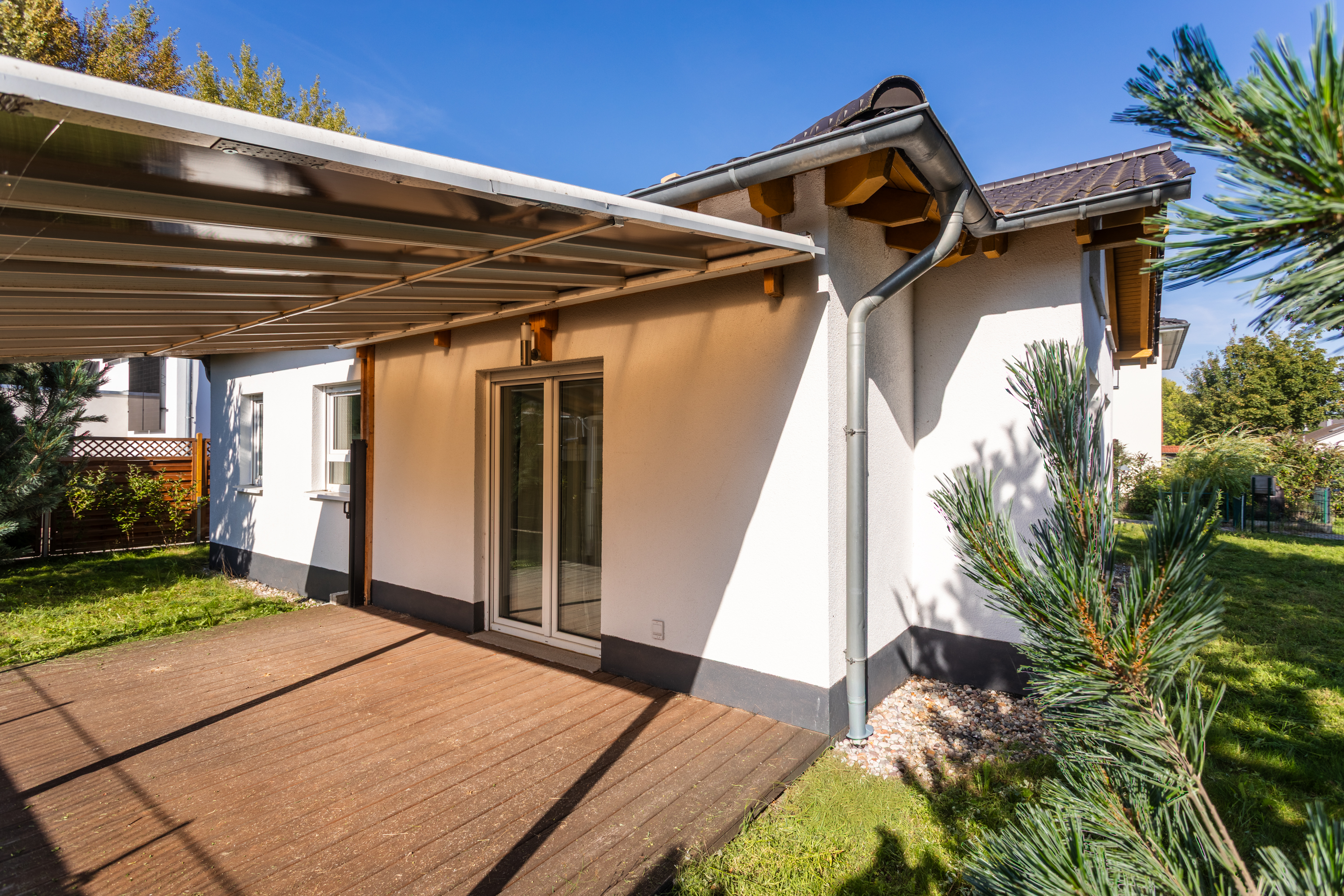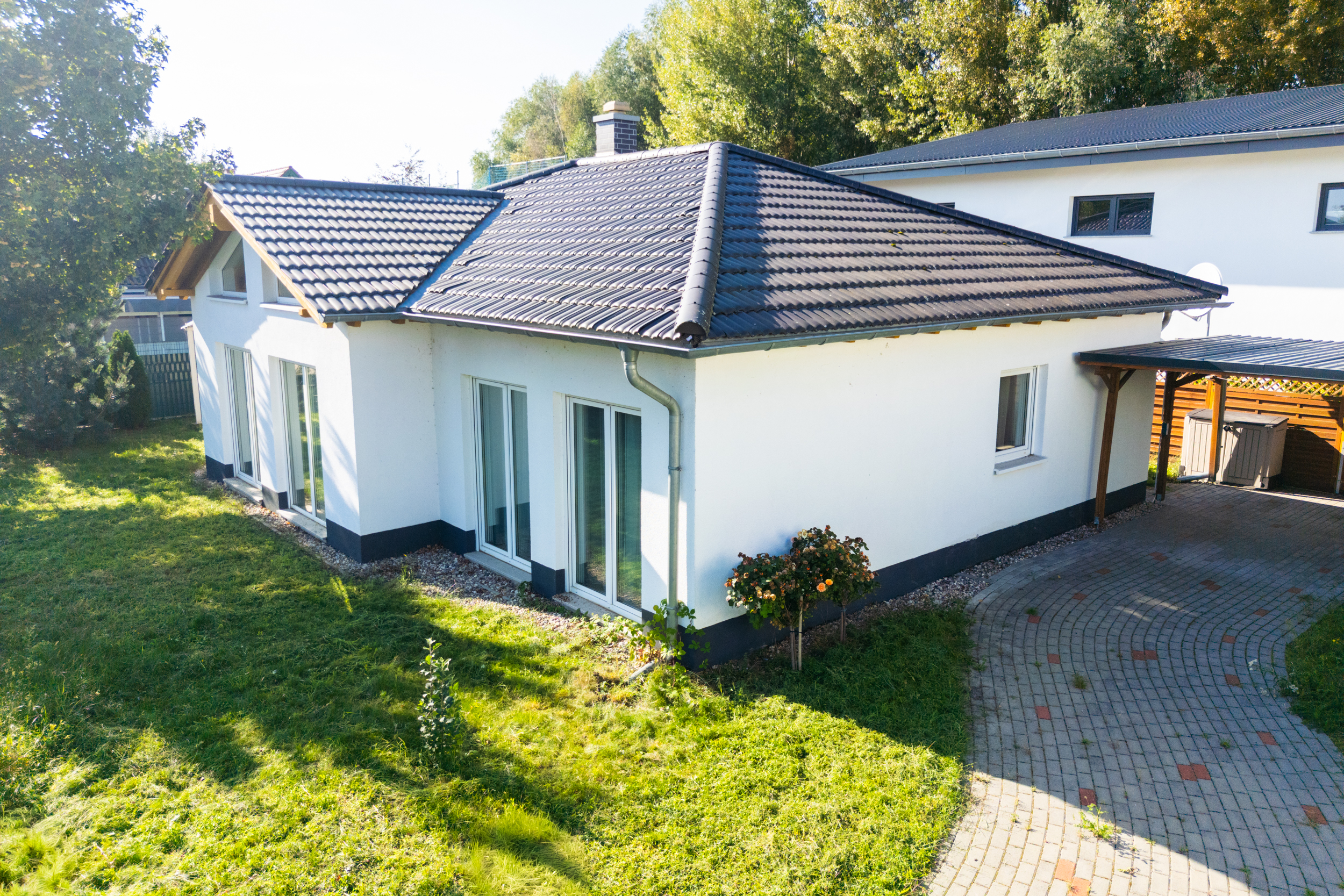 Das im Jahr 2016 in massiver Bauweise errichtete Haus befindet sich auf einem kleinen, pflegeleichten Erbbaugrundstück in ruhiger Lage nahe am Wasser in Werder (Havel). Ein eigener Carport mit Auffahrt sowie ein Gartenhaus bieten zusätzlichen Komfort. Die sonnige Terrasse ist durch Büsche und Bäume blickgeschützt – perfekt für entspannte Stunden im Freien. Der nicht ausgebaute Dachboden ist gedämmt, mit Beleuchtung ausgestattet und eignet sich hervorragend als praktische Abstellfläche. Insgesamt verfügt das Haus über drei Zimmer, zwei Bäder und eine durchdachte Raumaufteilung – ideal für Paare oder kleine Familien.