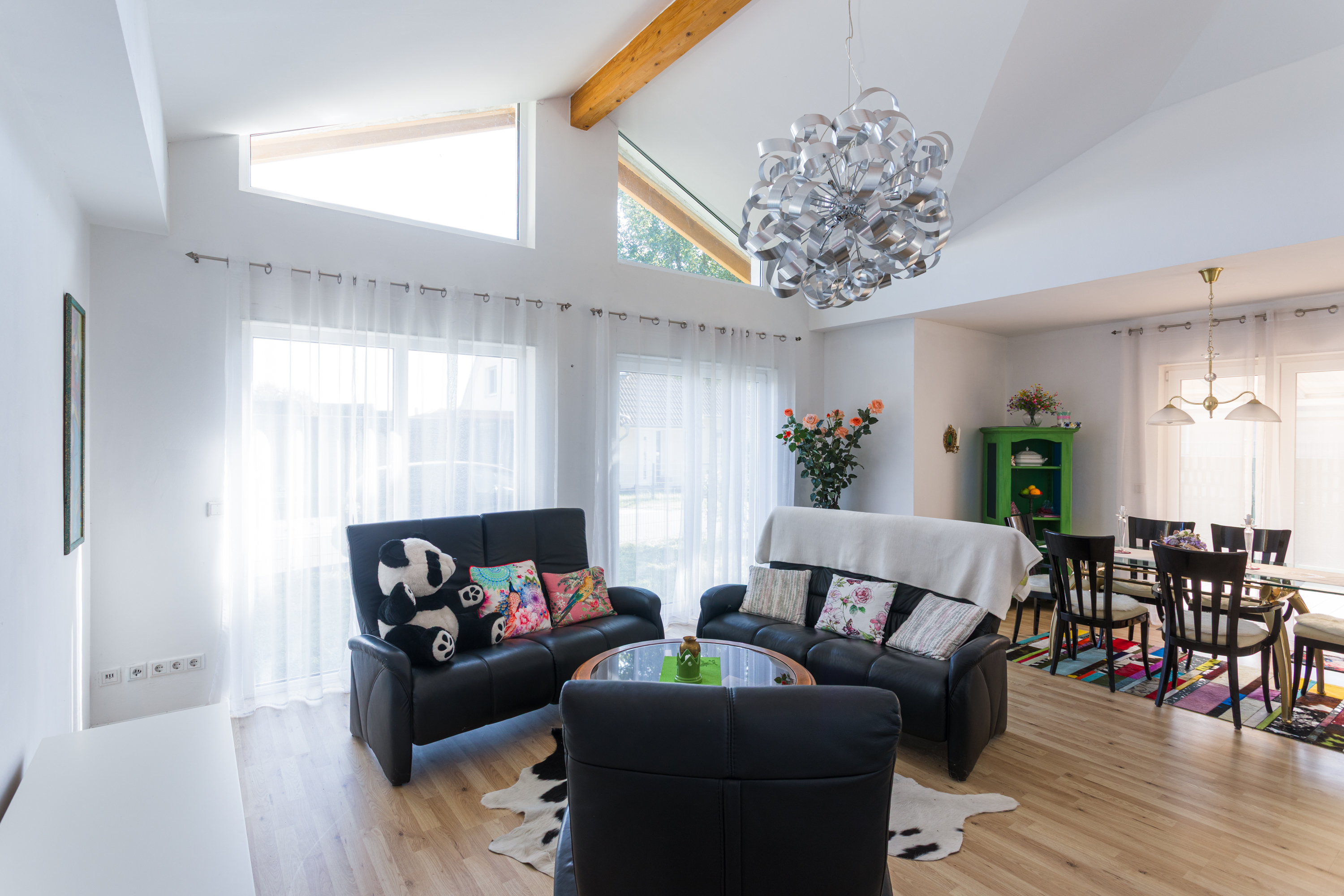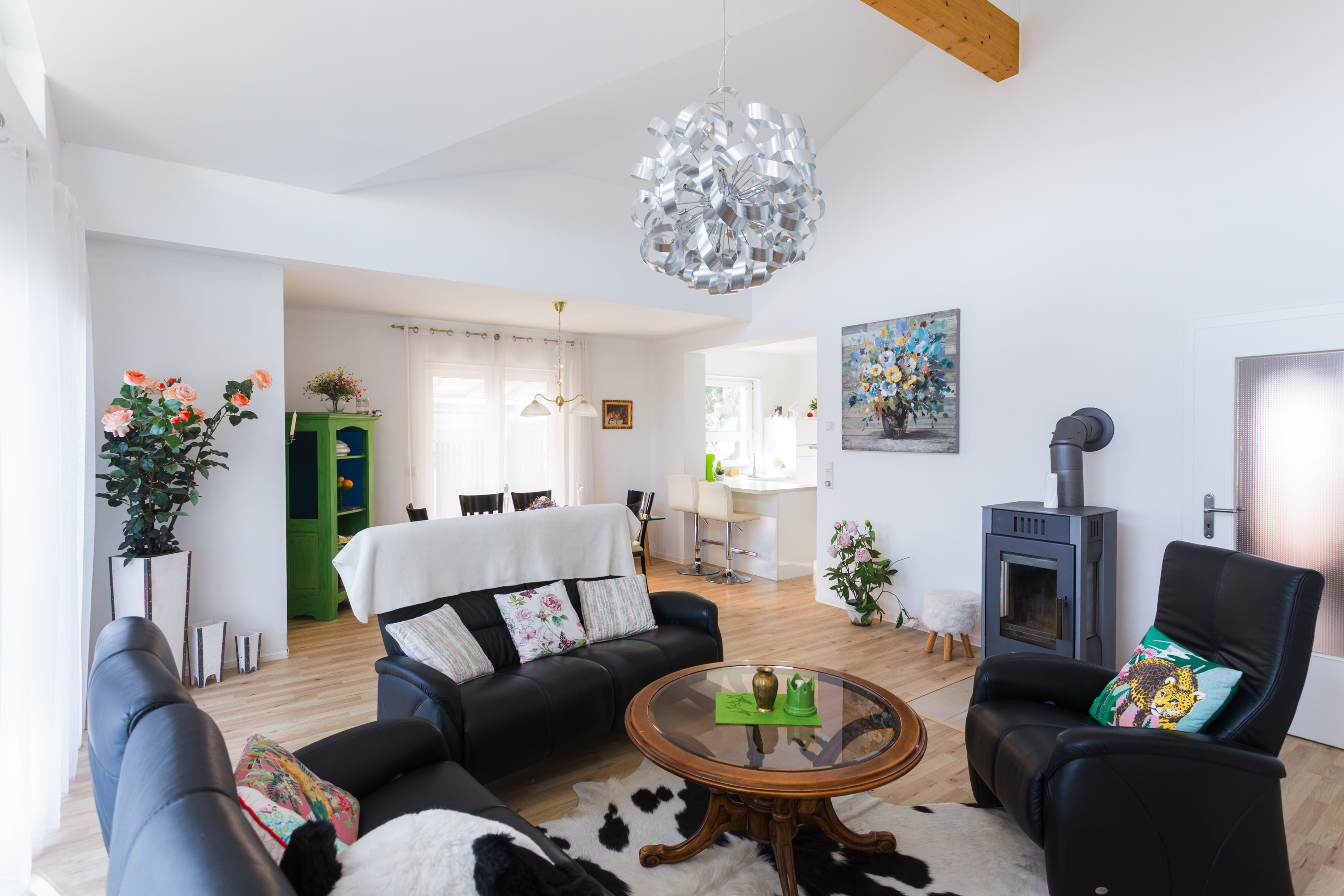 Das lichtdurchflutete Wohnzimmer bildet das Herzstück des Hauses. Eine große Fensterfront sorgt für ein angenehmes Raumgefühl und eröffnet den Zugang zur Terrasse und dem Garten. Die erhöhte Decke durch den teilweisen Dachausbau verleiht dem Raum zusätzlich Weite und Offenheit. Eine integrierte Essecke und ein herrlicher Kamin runden das gemütliche Wohnambiente perfekt ab – ideal für gesellige Abende mit Familie oder Freunden.