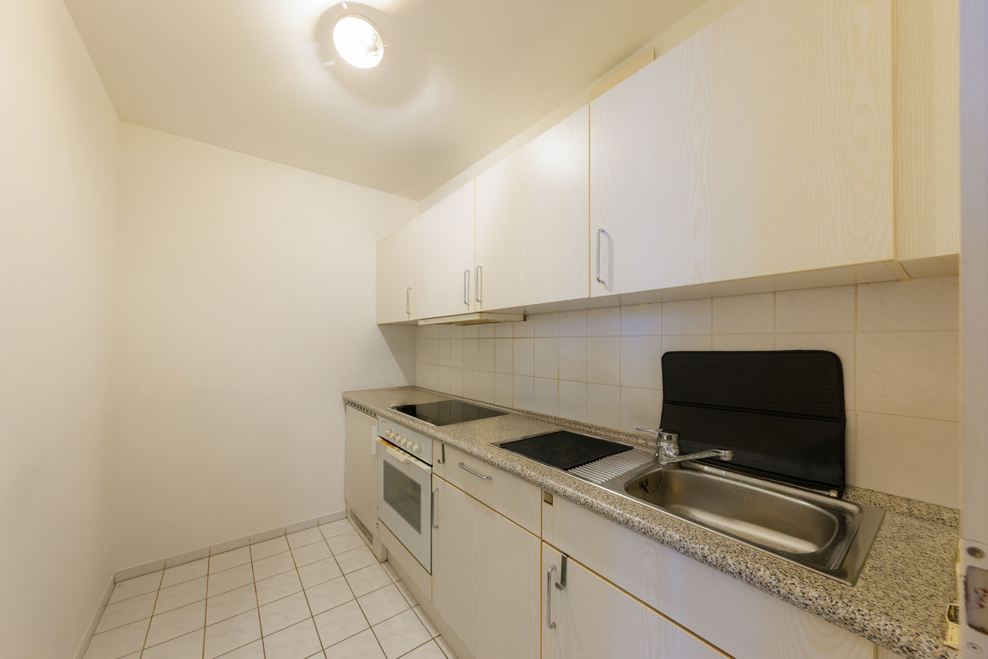 Die angrenzende Küche ist breit genug, um zusätzlich einen kleinen Frühstücksbereich zu integrieren. Die praktische Ausstattung ist ideal für den täglichen Gebrauch.