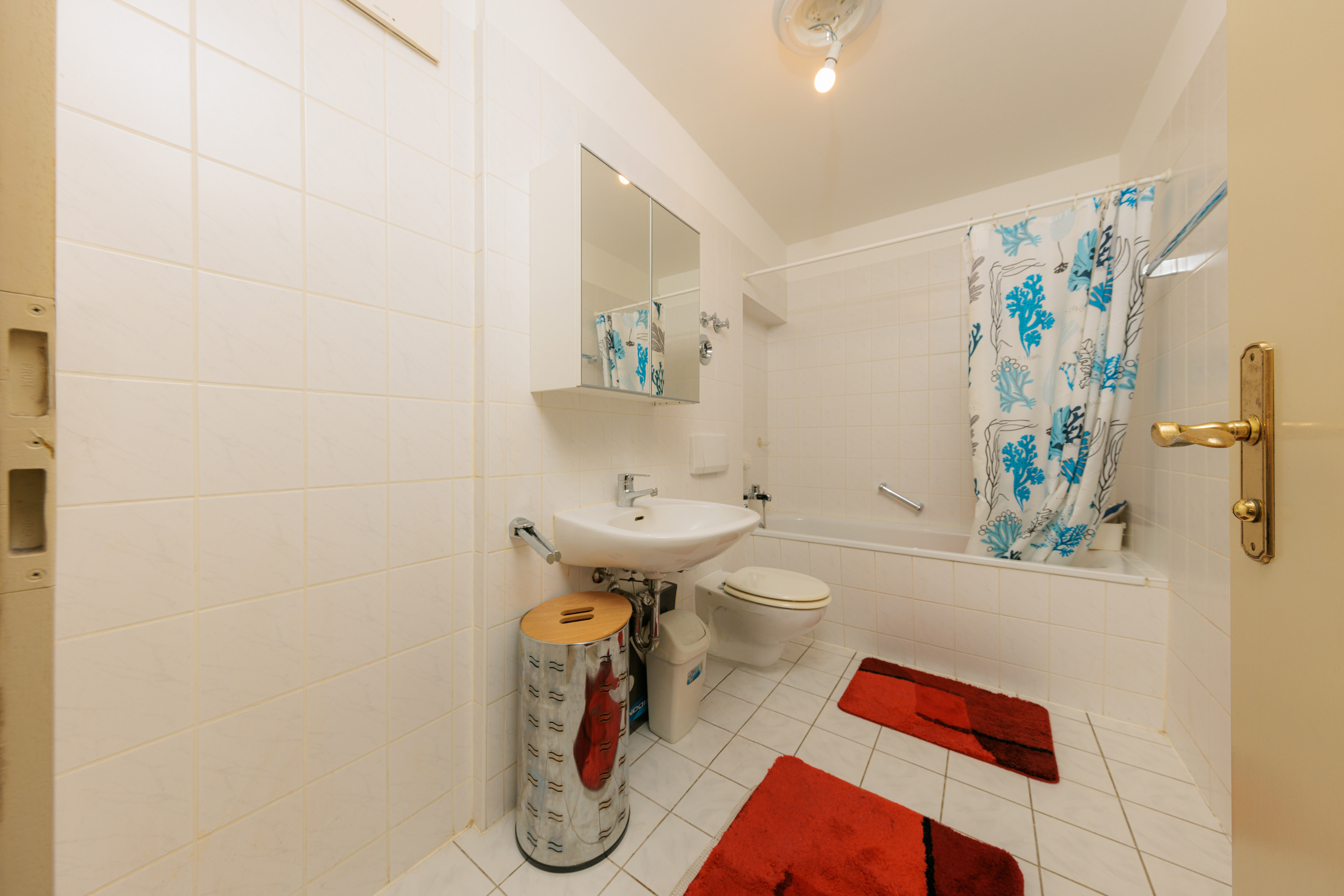 Das Badezimmer ist schlicht und zeitlos gestaltet, sowie funktional ausgestattet. Es verfügt über eine Badewanne, einen Lüfter sowie einen Waschmaschinenanschluss, der den Komfort im Alltag erhöht.