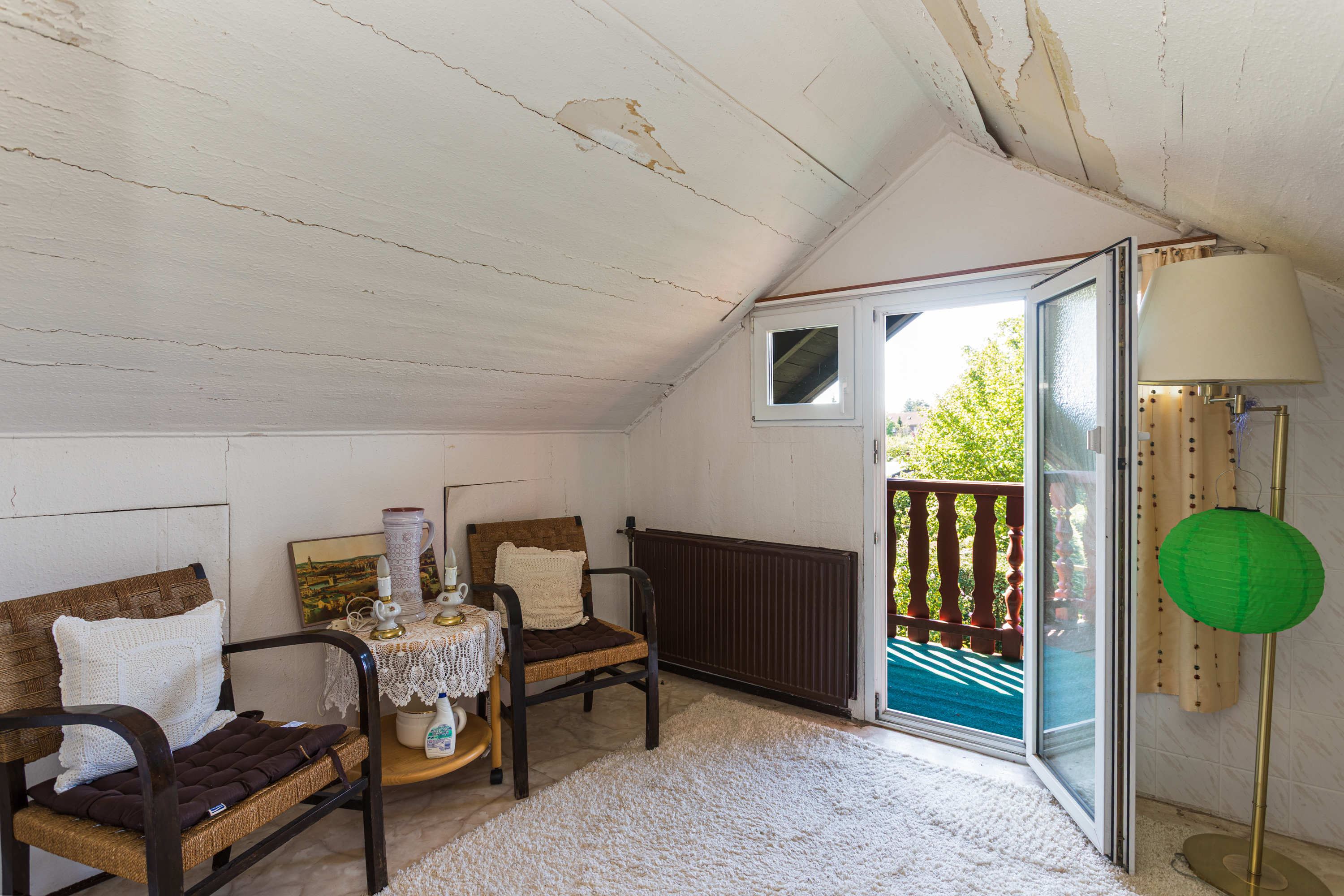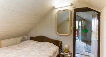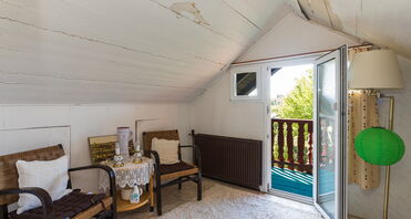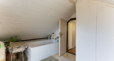 Über eine schmale Treppe gelangt man in das Dachgeschoss. Dort befindet sich ein kleines Schlafzimmer sowie ein weiteres Zimmer mit einer freistehenden Badewanne – ein charmantes Detail für entspannte Stunden. Von hier aus hat man Zugang zum Balkon, der mit seinem Ausblick und seiner ruhigen Lage besonders reizvoll ist.