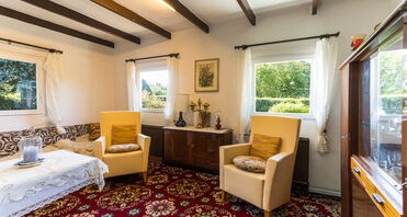 Das kleine Wohnzimmer im Erdgeschoss besticht durch seine Helligkeit und Gemütlichkeit. Drei große Fenster geben den Blick in den Garten frei und lassen viel Tageslicht herein. Eine kleine Couch sowie Stauraum in Form von Regalen oder Schränken finden hier bequem Platz.