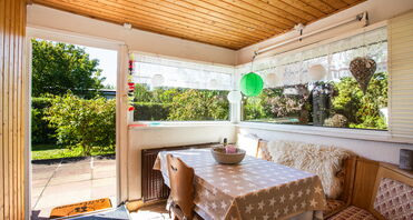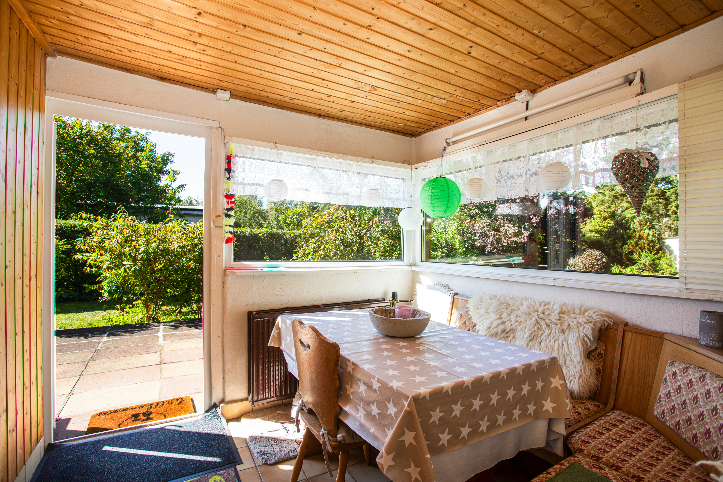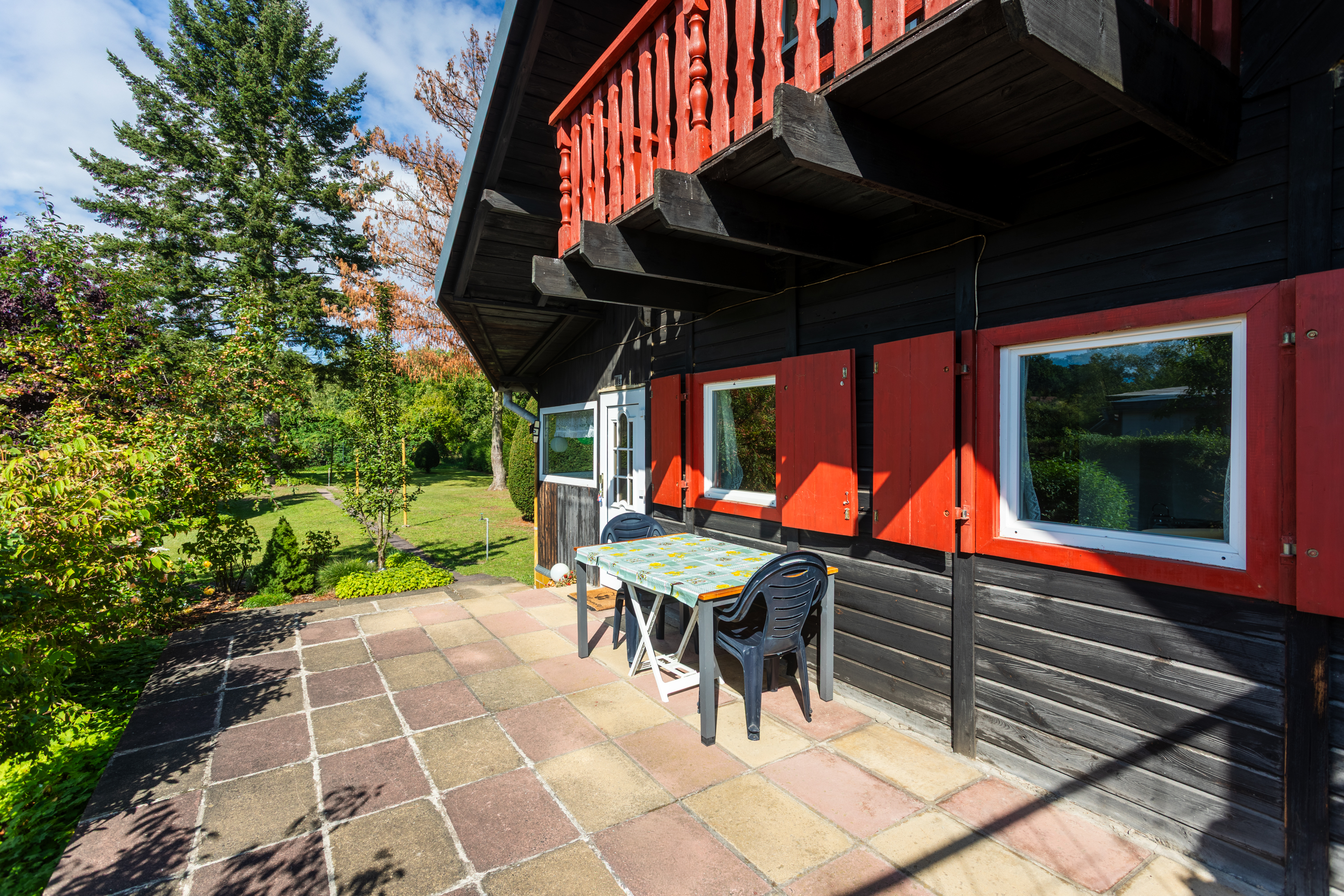 Der Zugang zum kleinen Holzhaus erfolgt über einen einladenden Eingangsbereich, der gleichzeitig als gemütliche Sitzecke dient. Große Fenster eröffnen hier einen herrlichen Blick in den liebevoll gepflegten Garten – ein perfekter Ort für die erste Tasse Kaffee am Morgen.