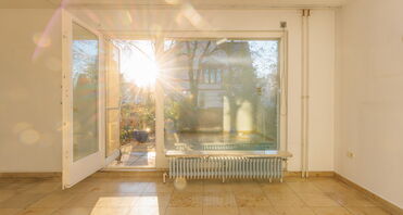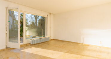 Linkerhand öffnet sich das beeindruckende, rund 47,85 m² große Wohn- und Esszimmer – das Herzstück der Wohnung. Große Fensterflächen geben den Blick ins Grüne frei und führen direkt auf die Terrasse. Der Raum lebt von seiner Weite und Helligkeit und bietet zahlreiche Gestaltungsmöglichkeiten. Wer modernes, offenes Wohnen bevorzugt, kann die Küche – wie bereits im Obergeschoss umgesetzt – in den Wohnbereich integrieren und so ein noch luftigeres Raumgefühl schaffen, ohne den repräsentativen Charakter zu verlieren.