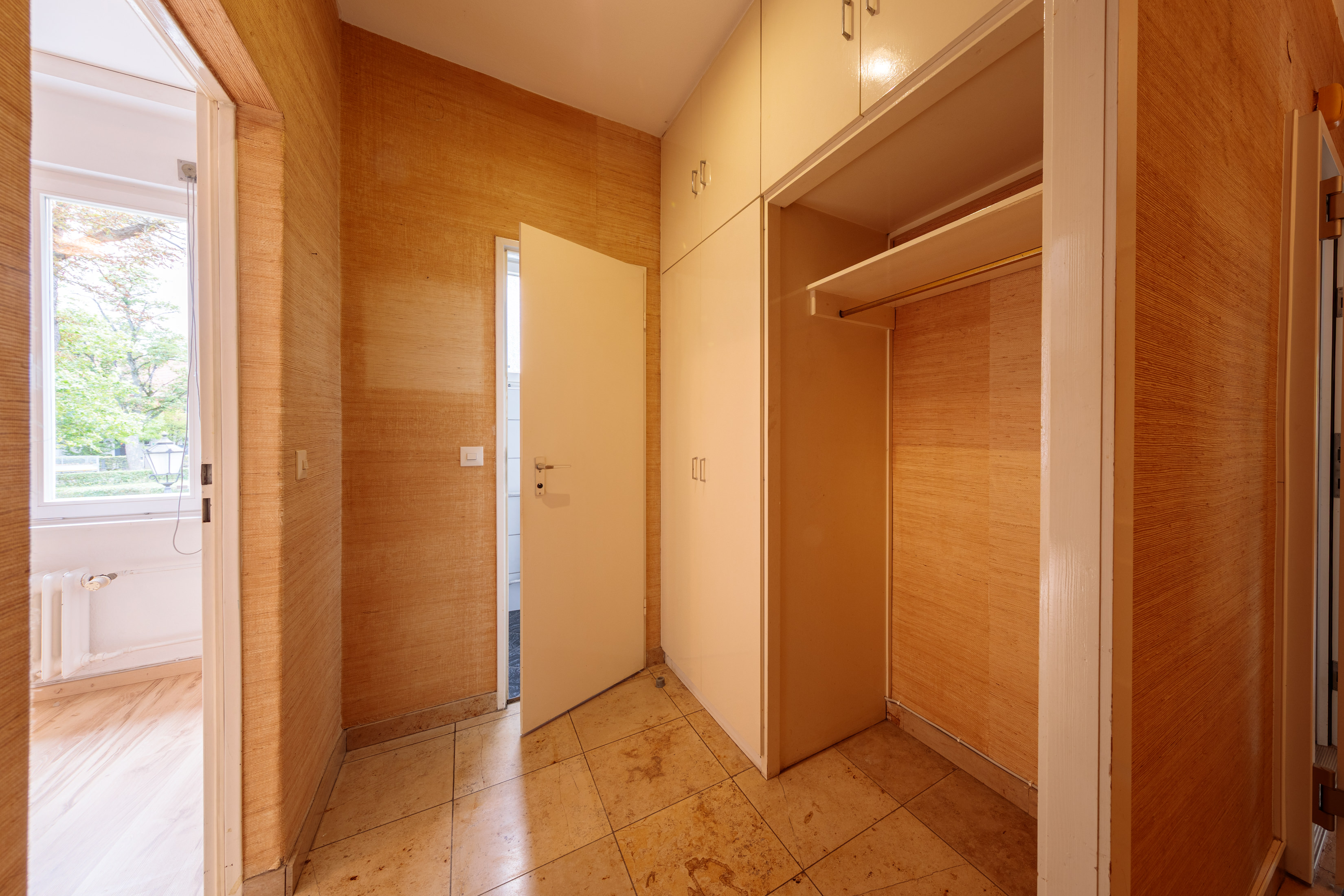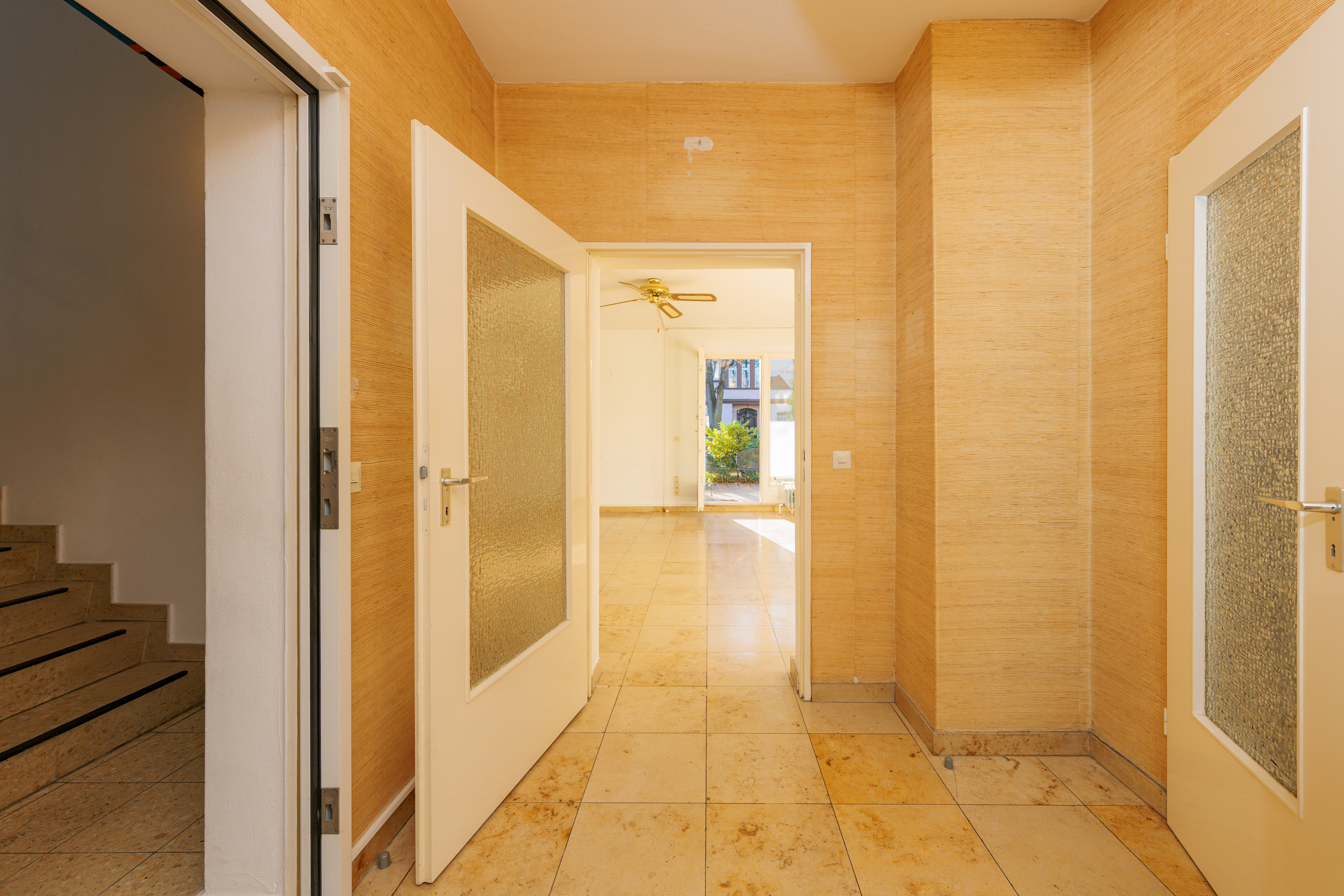 Der Zugang erfolgt über das Hochparterre und ein gepflegtes Treppenhaus – schon beim Betreten vermittelt die Wohnung ein Gefühl von Großzügigkeit. Der einladende Flur bietet mit zwei geschickt integrierten Einbauschränken ausreichend Platz für Garderobe und Stauraum. Der hochwertige Steinboden setzt dabei einen eleganten Akzent und unterstreicht den stilvollen Charakter des Zuhauses.