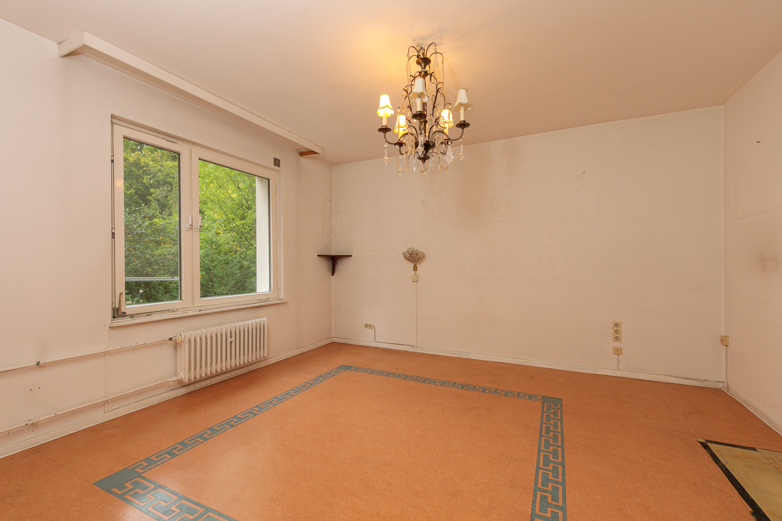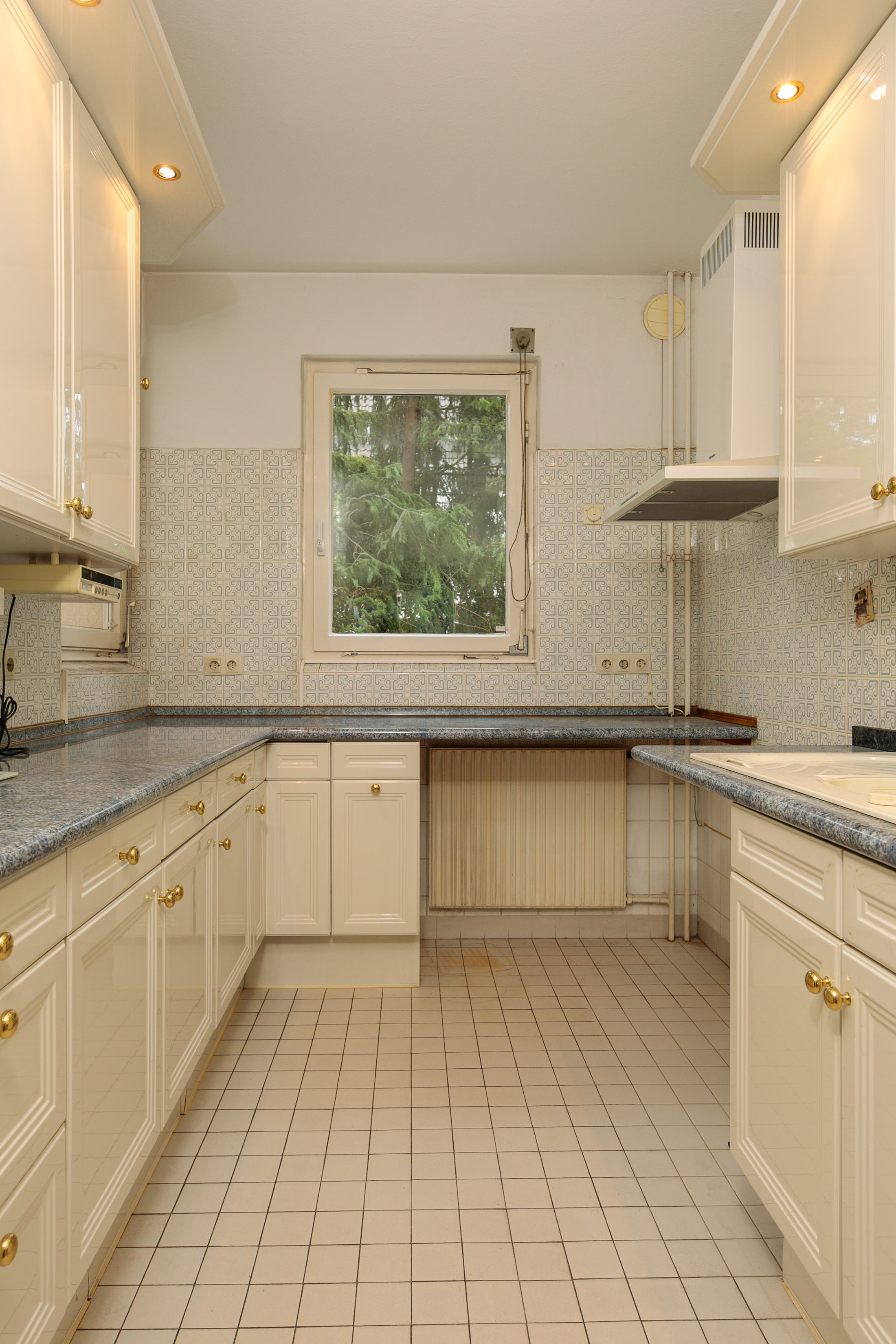 Die Küche ist derzeit separat vom Flur zugänglich und überzeugt mit funktionaler Planung, viel Arbeitsfläche und praktischen Einbaumöglichkeiten. Zwei über Eck angeordnete Fenster sorgen für angenehmes Tageslicht und lassen auch hier den Blick ins Grüne schweifen.