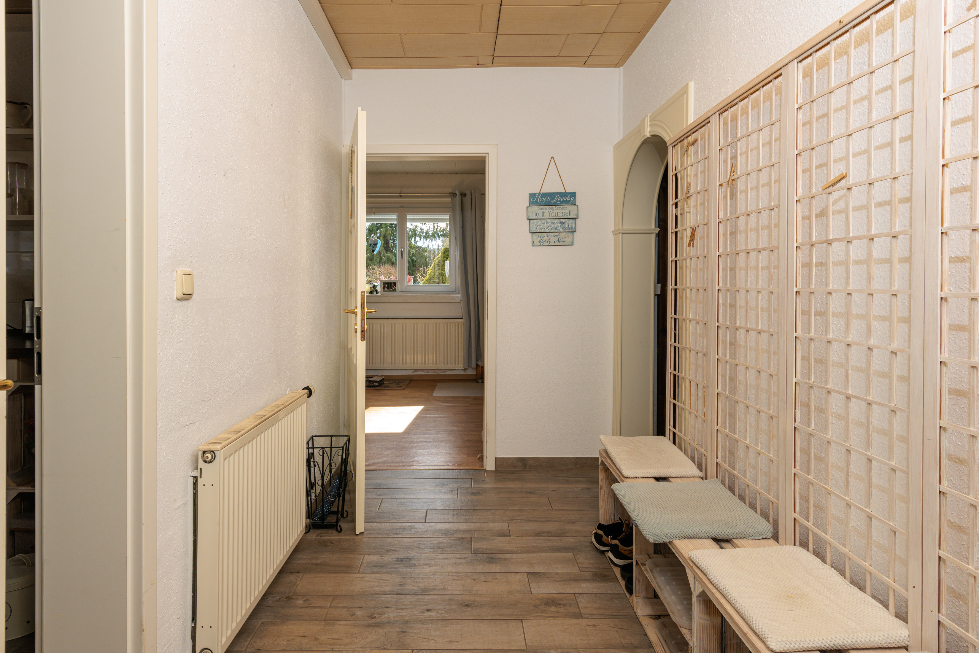 Der Eingangsbereich empfängt Sie hell und freundlich und bietet einen angenehmen ersten Eindruck. Direkt auf der linken Seite befindet sich ein praktischer Abstellraum, in dem auch die Heizung untergebracht ist. Dieser Raum bietet viel Stauraum für Dinge, die im Alltag nicht sichtbar sein sollen.