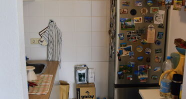 Die Küche ist als offene Nische gestaltet und über einen kleinen Vorraum vom Wohnzimmer aus begehbar. Eine kompakte Küchenzeile mit Herd, Ofen und Spüle ist vorhanden und gehört dem Mieter, zudem bietet der Bereich ausreichend Platz für einen großen Kühlschrank. Der Vorraum eignet sich ideal als praktische Abstellfläche.