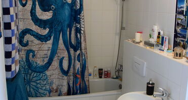 - Badezimmer raumhoch gefliest.