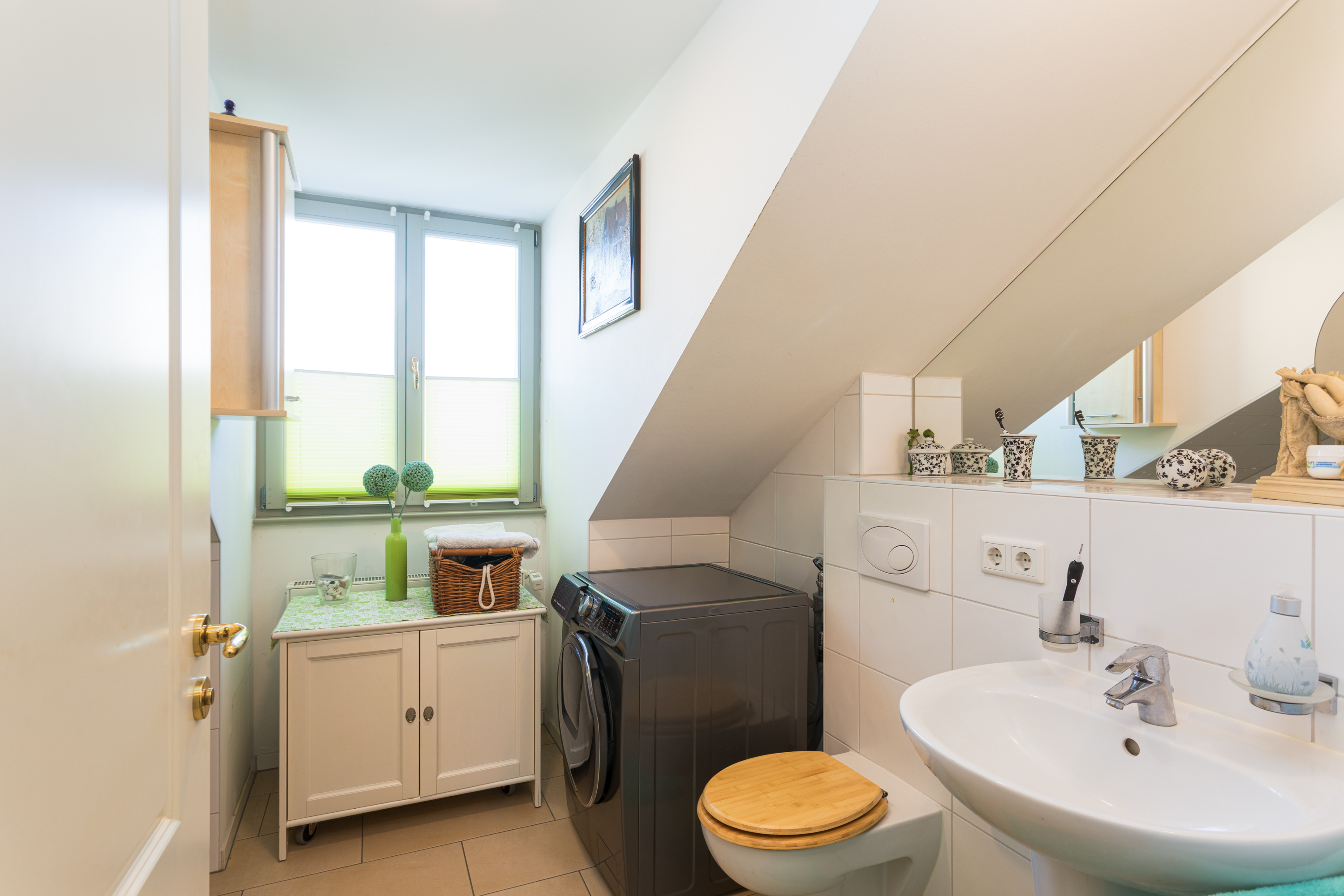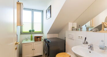 Linkerhand befindet sich das Bad mit Badewanne und Waschmaschinenanschluss. Ein Fenster sorgt hier für ausreichend Belichtung und Belüftung.