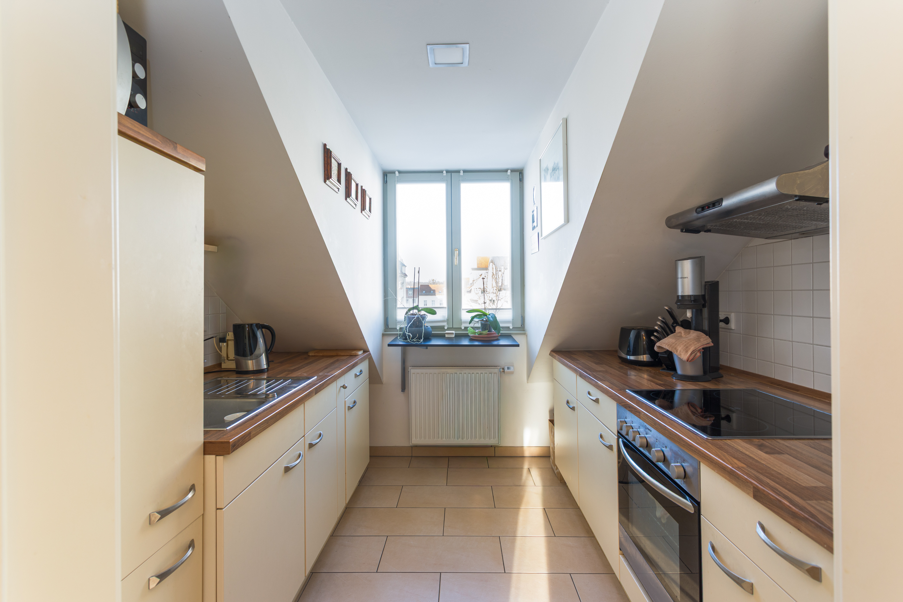 Anschließend gelangt man in die Küche, die mit einer Einbauküche ausgestattet ist und einen beeindruckenden Blick in Richtung Babelsberg-Nord bietet.