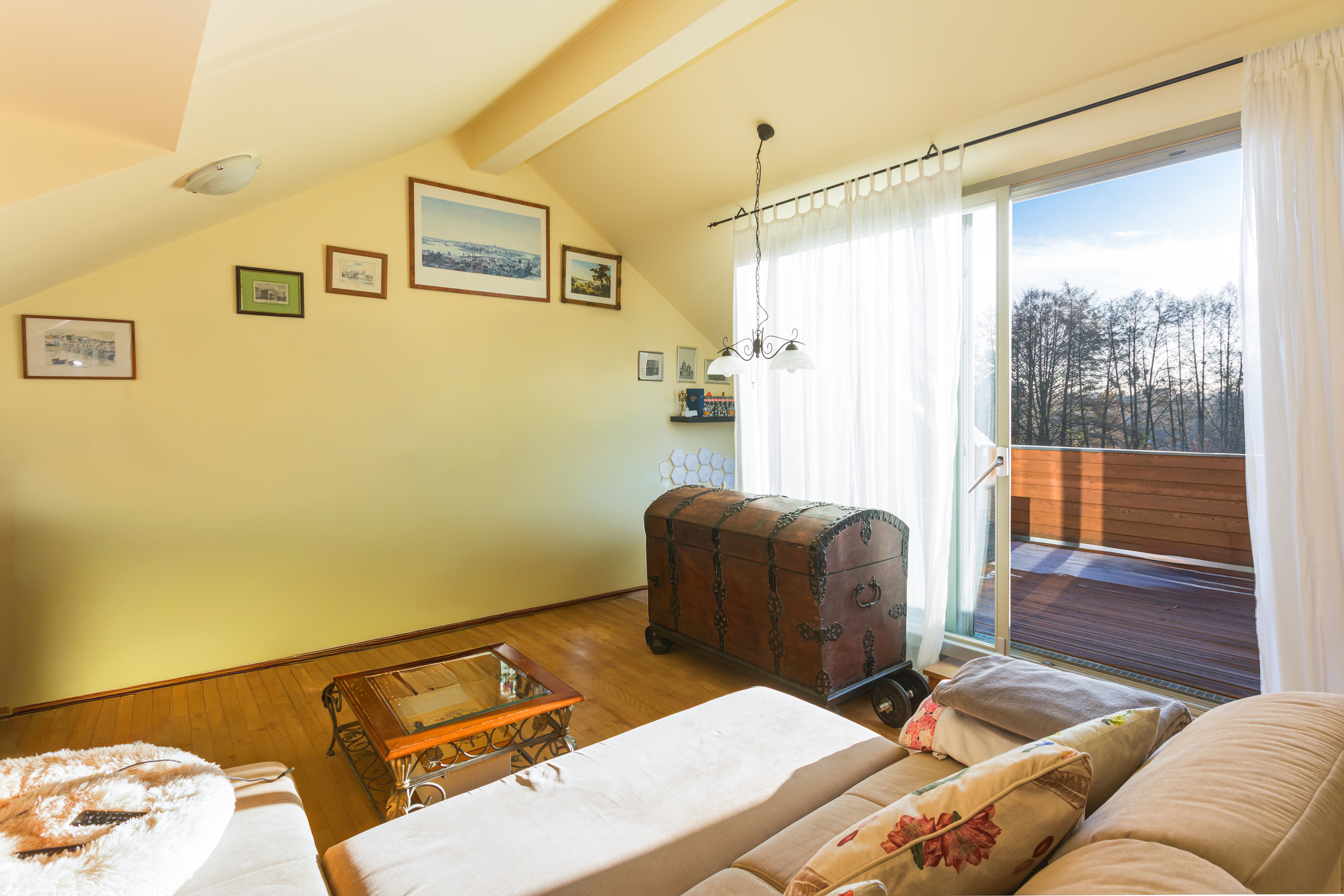 Gegenüber dem Eingangsbereich öffnet sich das geräumige Wohnzimmer mit Gaube. Edles Echtholz-Parkett sorgt hier für ein besonders behagliches Wohnambiente. Der Raum bietet ausreichend Platz für eine große Couch sowie eine gemütliche Nische, ideal für eine Leseecke oder einen Arbeitsbereich. Ein separater Abstellraum bietet zusätzlichen Stauraum für den Alltag.