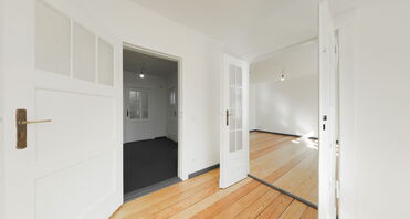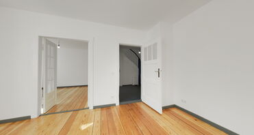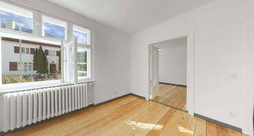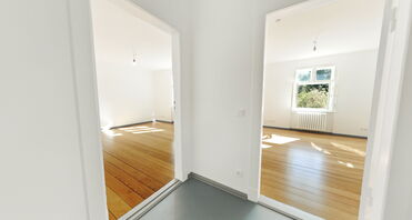 Das Wohn- und Esszimmer zeigt sich hell, großzügig und repräsentativ. Verbunden durch eine stilvolle Doppelflügeltür und ausgestattet mit aufgearbeitetem, originalem Dielenboden, bieten diese Räume ein besonderes Wohnambiente mit viel Charme und Licht.
