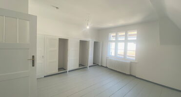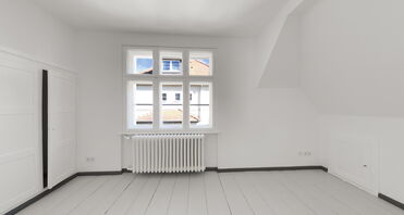 Über die geschwungene Holztreppe gelangen Sie in das Dachgeschoss. Hier befinden sich zwei geräumige Schlafzimmer, ebenfalls mit Dielenboden, der in einem dezenten hellgrauen Mattton gestrichen wurde. Die originalen Einbauschränke sowie zusätzliche Abstellflächen in den Abseiten sorgen für praktischen Stauraum.