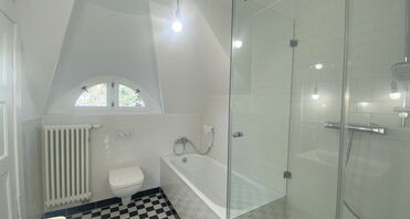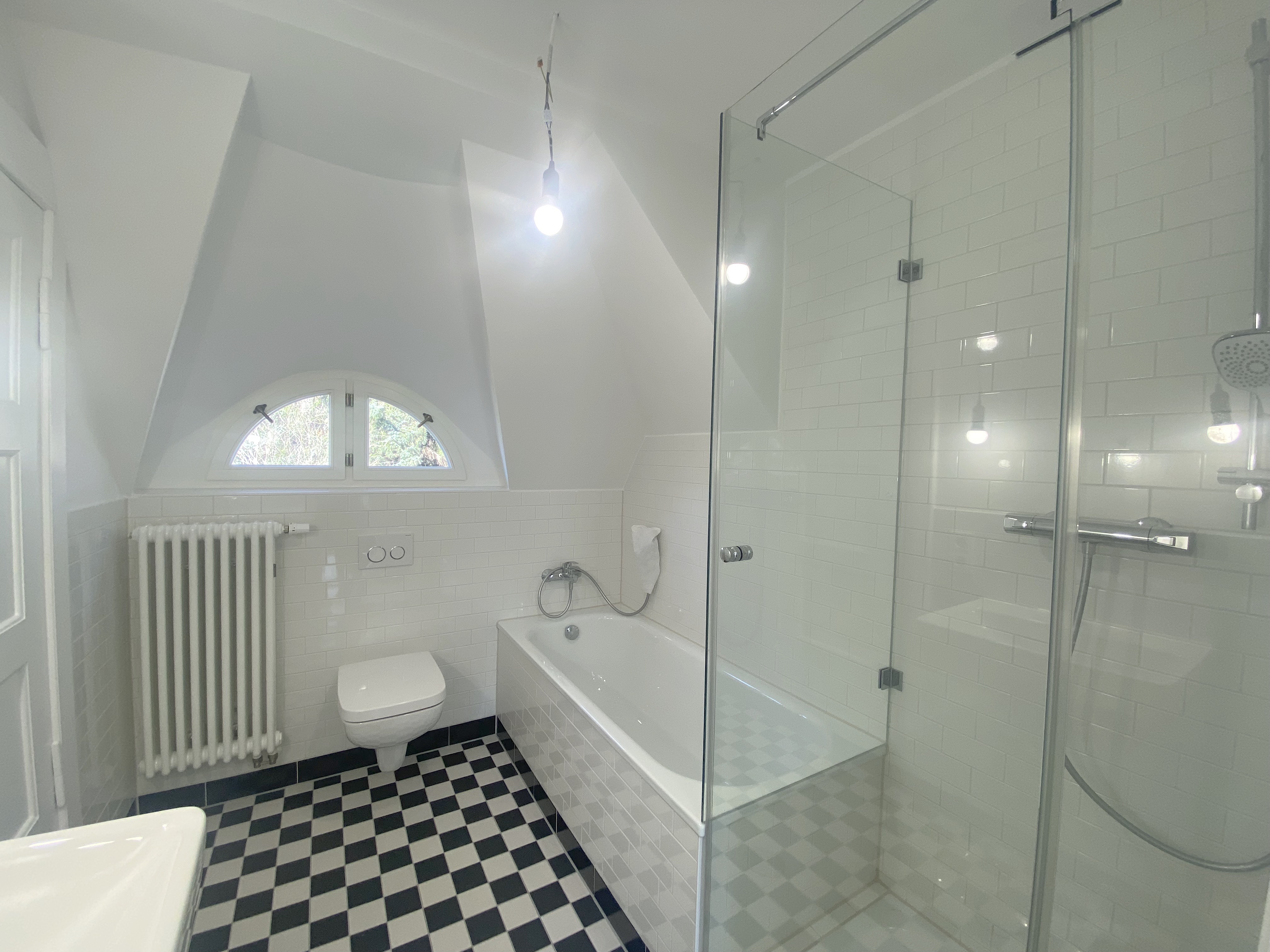Das Badezimmer wurde vollständig erneuert und überzeugt mit einer Kombination aus Schachbrettfliesen und klassischen Metrofliesen. Es verfügt über eine Dusche sowie eine separate Badewanne. Eine charakteristische Fledermausgaube sorgt für angenehme Belichtung und Belüftung. Von hier aus erreichen Sie zudem den Spitzboden, der weiteren Abstellraum bietet.