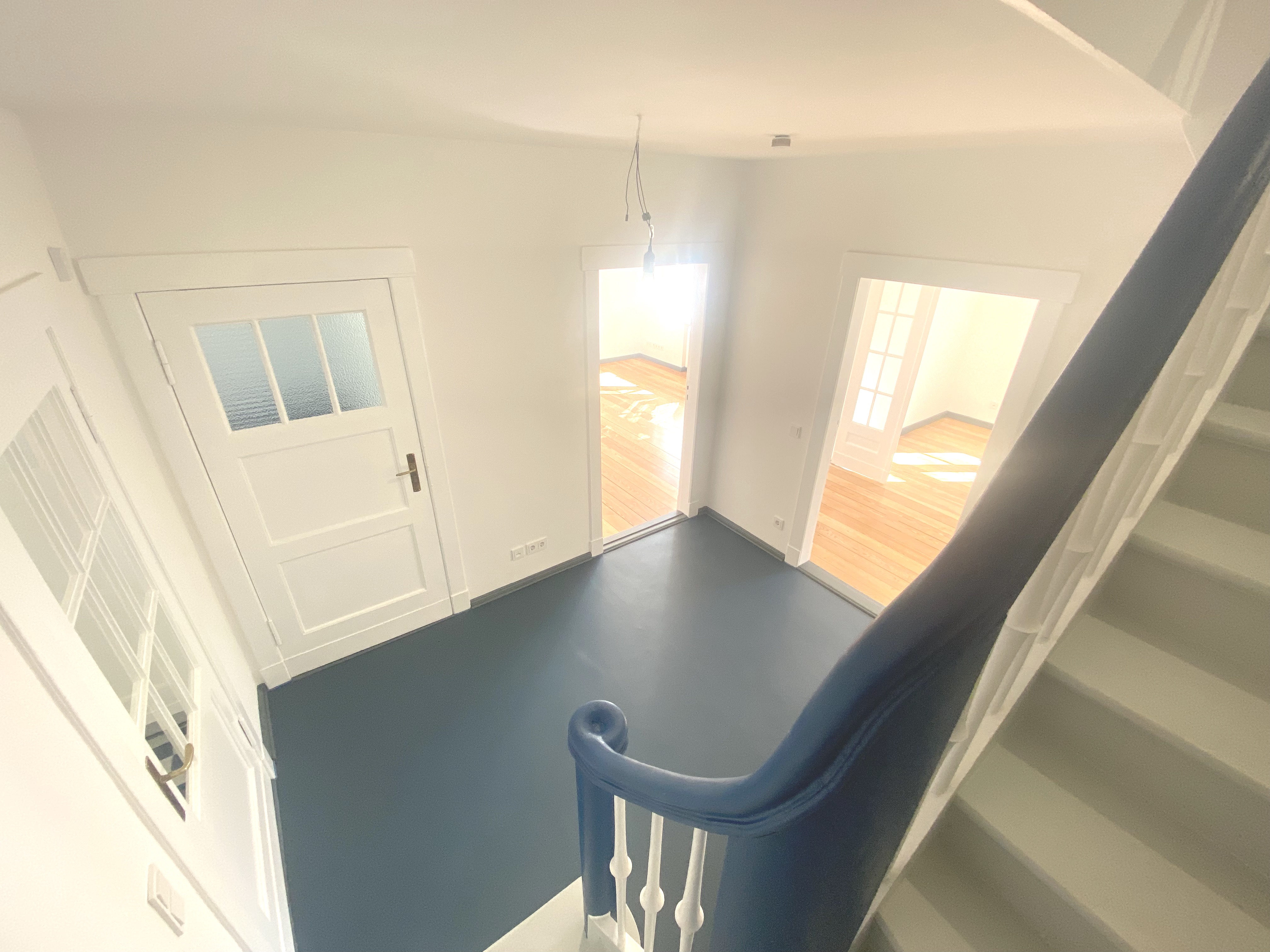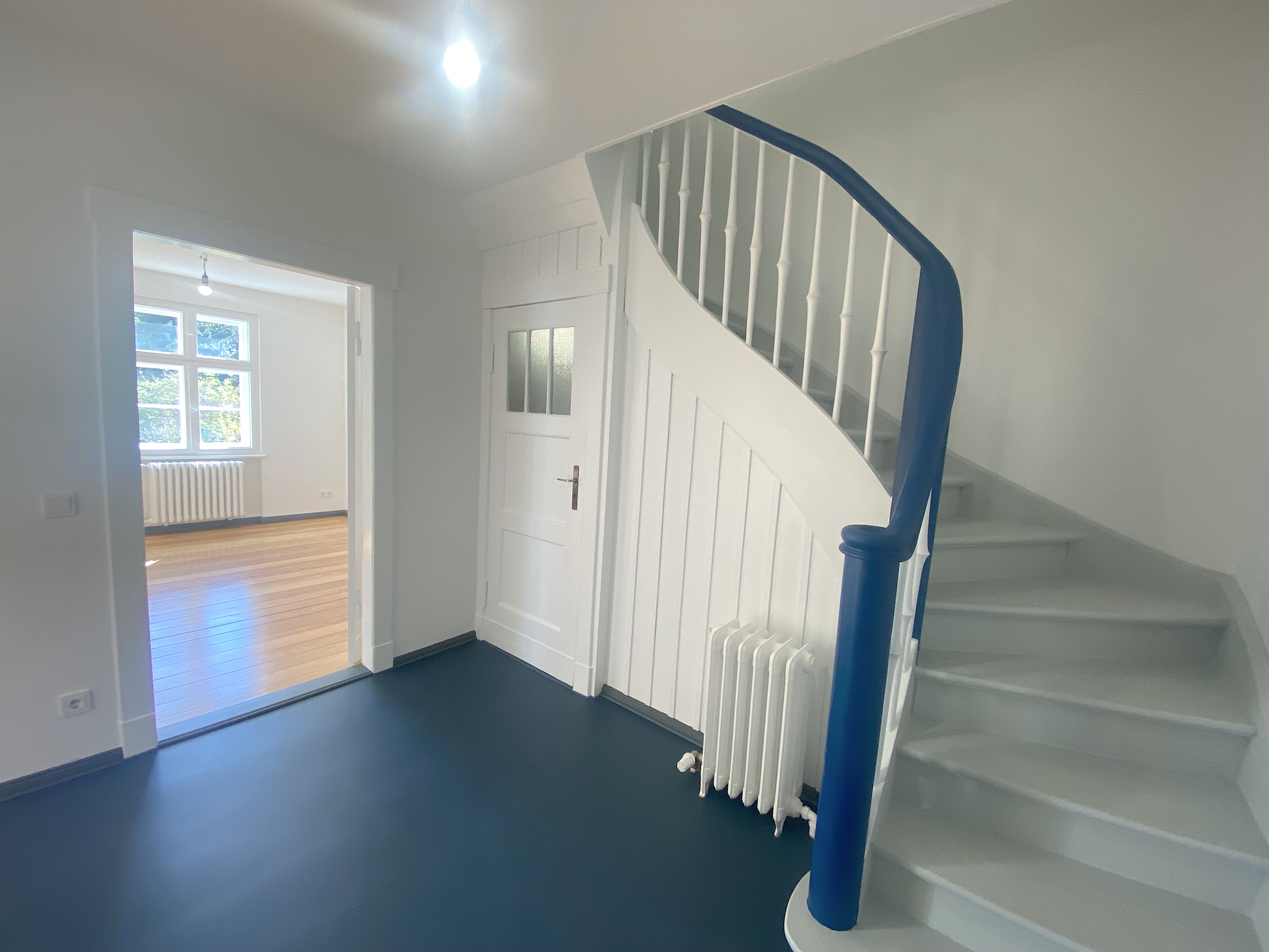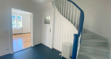 Die zentrale Diele bildet das Herzstück des Erdgeschosses und erschließt alle Räume sowie die oberen Etagen. Ein besonderer Blickfang ist die aufgearbeitete, geschwungene Original-Holztreppe in elegantem matt-blau-weiß, die dem Haus eine individuelle Note verleiht. Hochwertiges, farblich abgestimmtes Linoleum rundet das stimmige Gesamtbild ab.