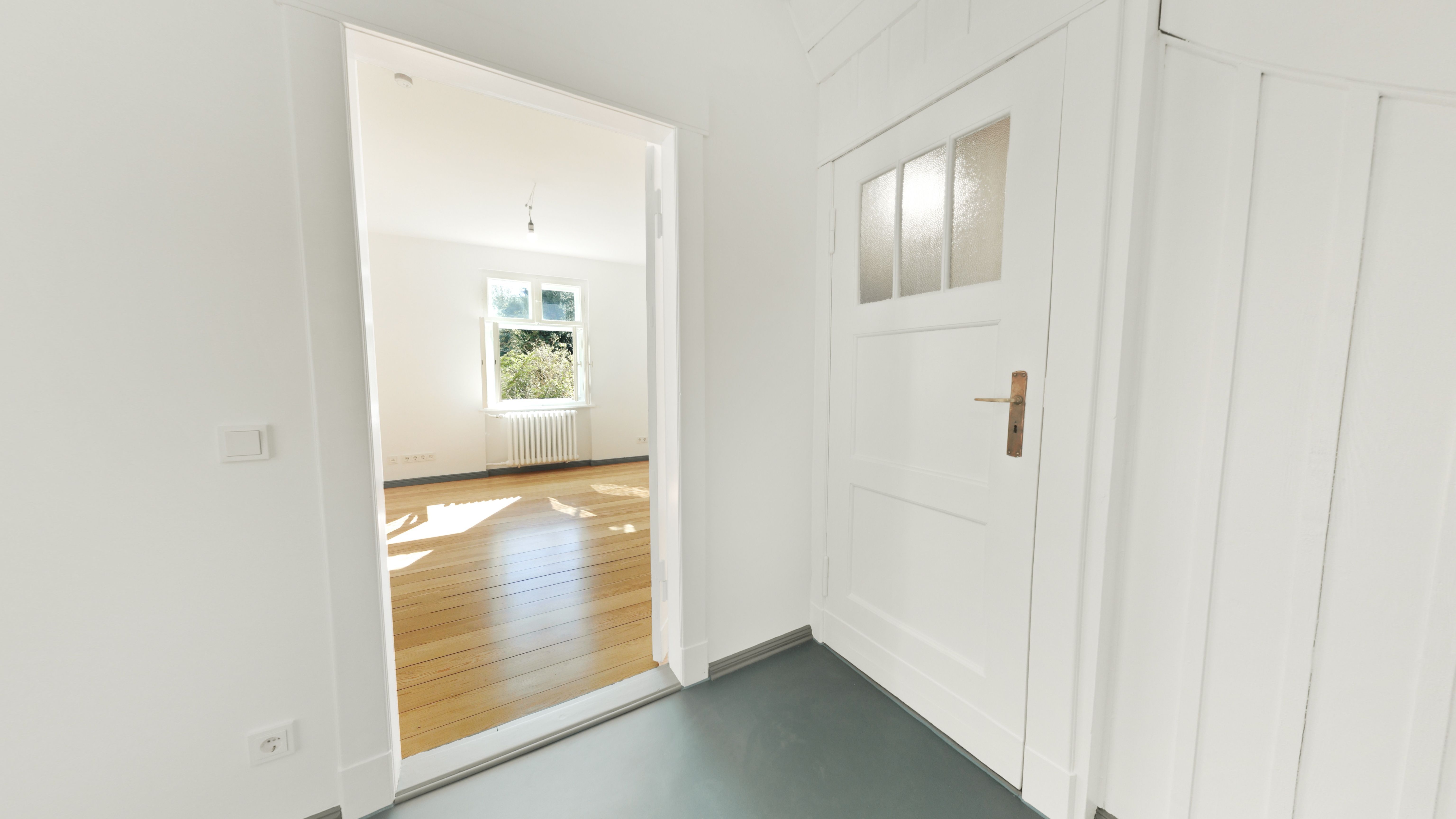 Das Haus empfängt Sie über einen seitlich, straßenabgewandt gelegenen Eingang. Bereits der einladende Windfang im charmanten Verandastil mit originalen Holzschiebefenstern und Blick in den Garten vermittelt ein besonderes Wohngefühl. Der klassische schwarz-weiß geflieste Boden im Schachbrettmuster unterstreicht den stilvollen ersten Eindruck. Von hier aus gelangen Sie in den Vorflur mit Platz für eine Garderobe sowie in das geschmackvoll gestaltete Gäste-WC mit zurückhaltenden Metrofliesen.